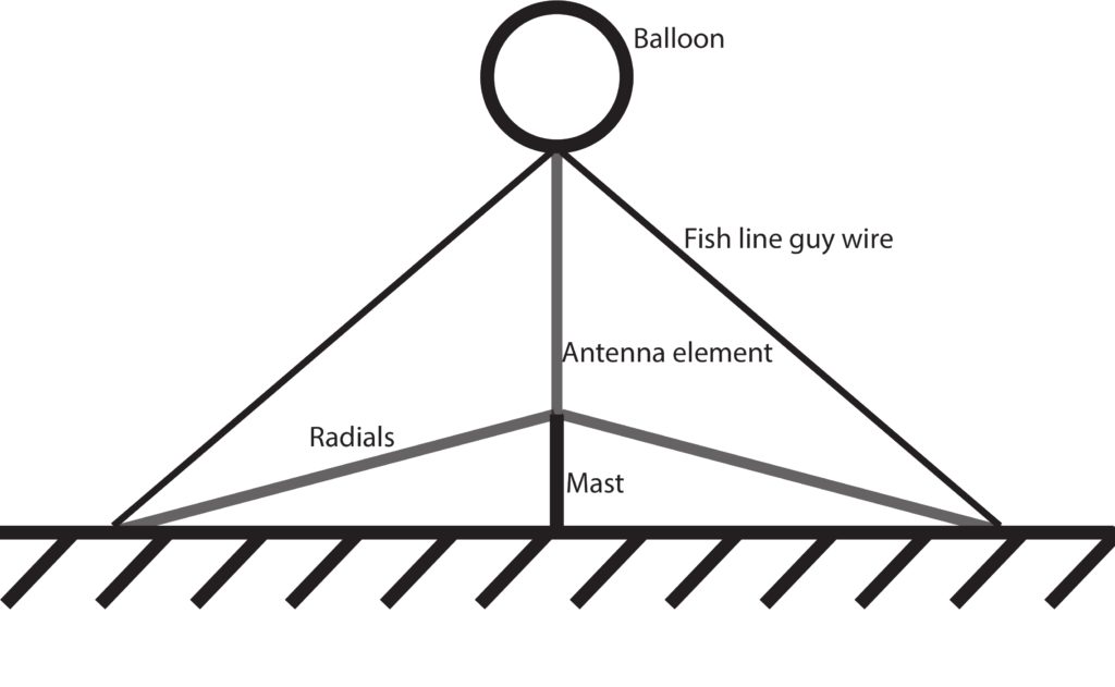 When we arrived, we found that the barrier was open, which allowed us to drive to the center of the parking lot. We unloaded all the equipment and prepared to fly the antenna. The parking lot was made of dry rock, which would have made a horrible ground plane. Fortunately, we planned to use elevated radials. The balloon was not strong enough to carry all the radials, at least not tightly, so the plan was to use our 12m spiderbeam glass fiber mast to support the radials and have the balloon lift only the element. There was only one issue: we forgot the mast.