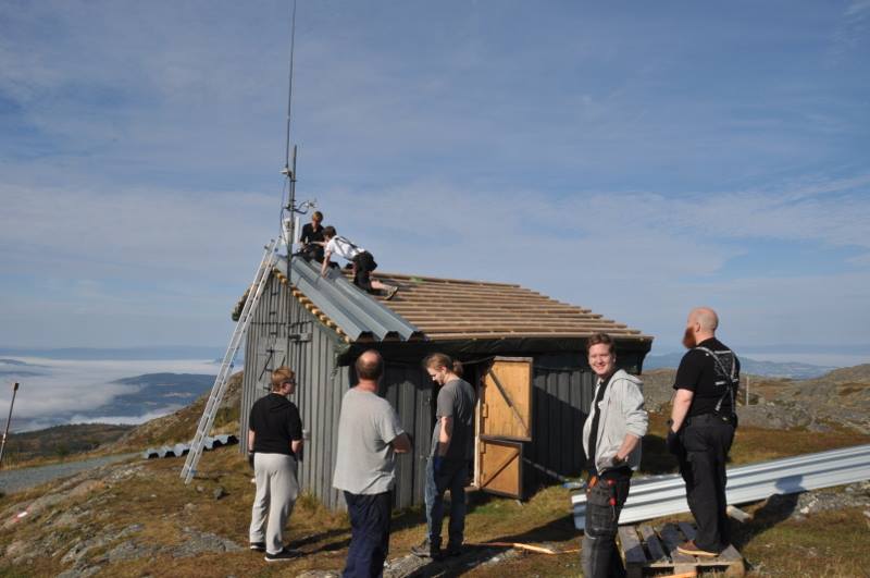 The cabin that houses our beacons is placed near the foot of a 196 m tall telecommunications tower. When icicles fall from this height they have a tendency to pierce the roof on our cabin, therefore we reinforced the roof with steel plates (building progress seen to the right above) in the summer of 2016.