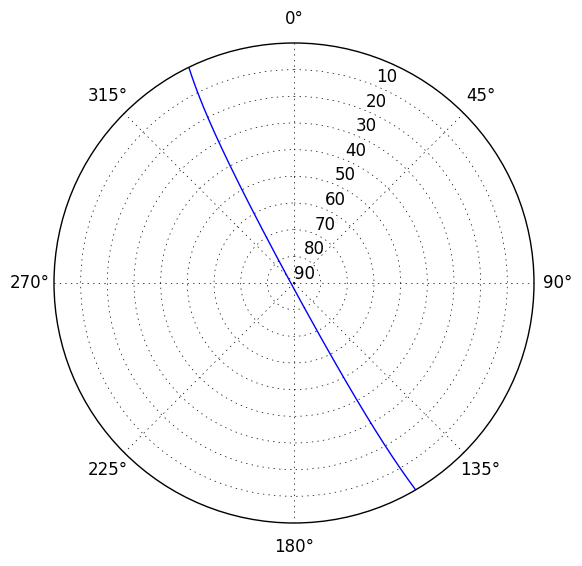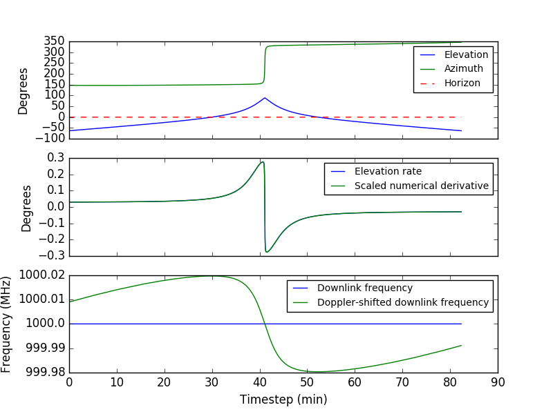 For pass 1, the first derivative of the elevation is almost discontinuous at the elevation peak, which is to be expected around 90 degrees elevation. For satellites that would not pass directly overhead, like pass 2, the elevation will have more continuous first derivatives. The change in the azimuth for pass 1 seems extreme, but since the antenna is pointing with an elevation close to 90 degrees, the required change in antenna position would not be very significant. This is better seen when plotting the properties in a polar diagram.