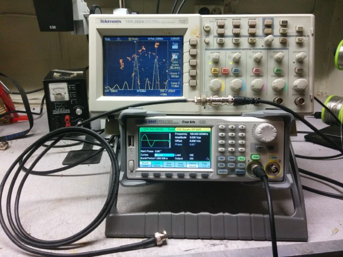 To be able to measure on the short RG58 cable I am using a 1 cycle 100 MHz sine wave burst. The burst is set up to repeat every second, this means that any remaining oscillations should have fully died out. A generator frequency of 10 MHz is sufficient to get accurate results, but only if the cable you are measuring is longer than 20 m.
