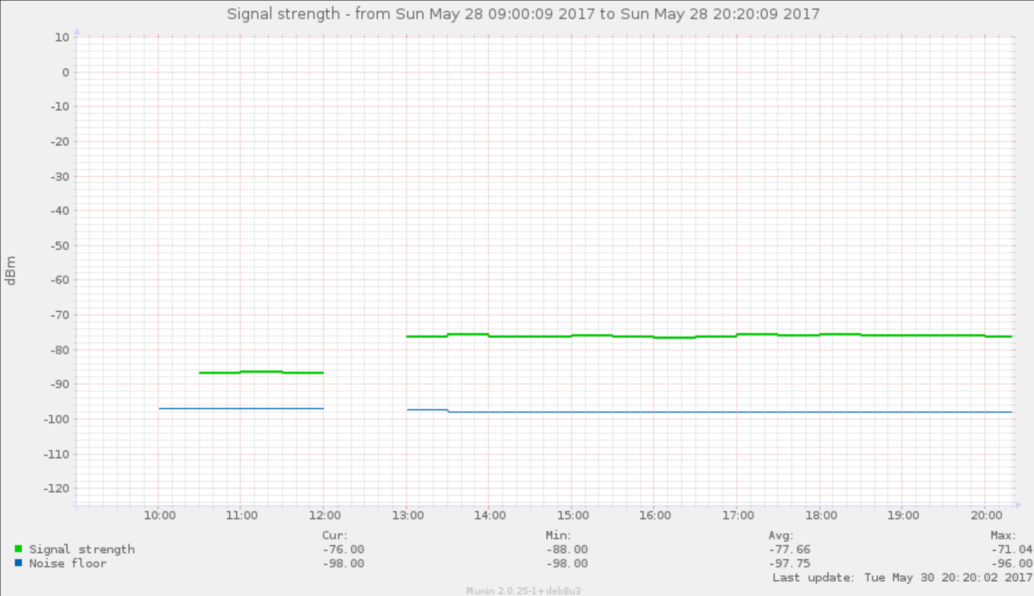 When we took the link down at 12.00 UTC the link margin was 10 dB. We had it up again an hour later, and the link margin is now 22 dB. This is very much in line with the cable loss improvement mentioned above.