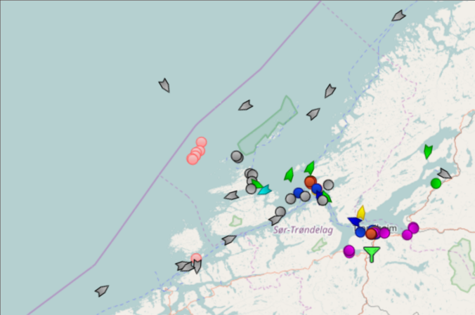 AIS messages from boats near the Trondheim coastline. Vassfjellet receiving station in lower right.