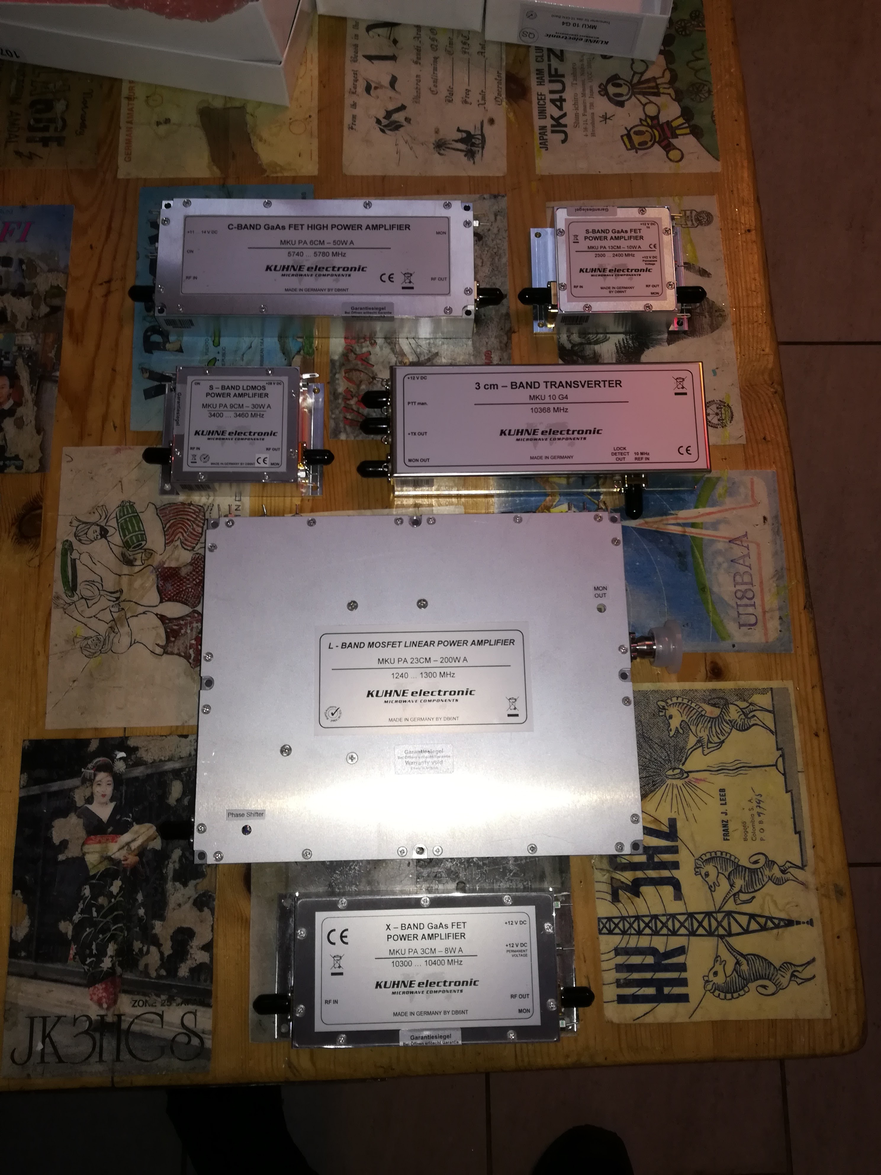 - The amplifiers and transverter laid out on our QSL table.
