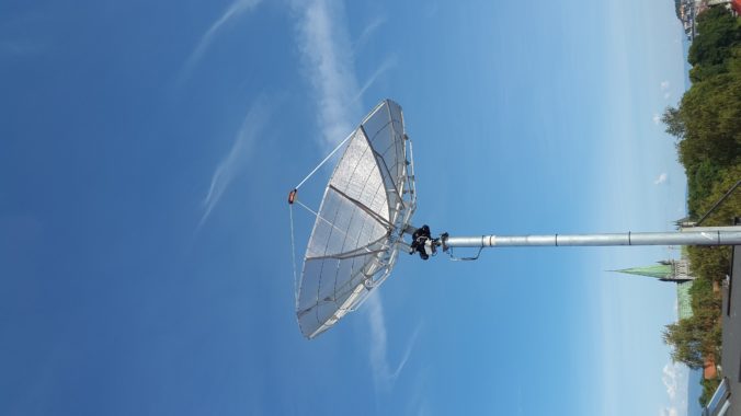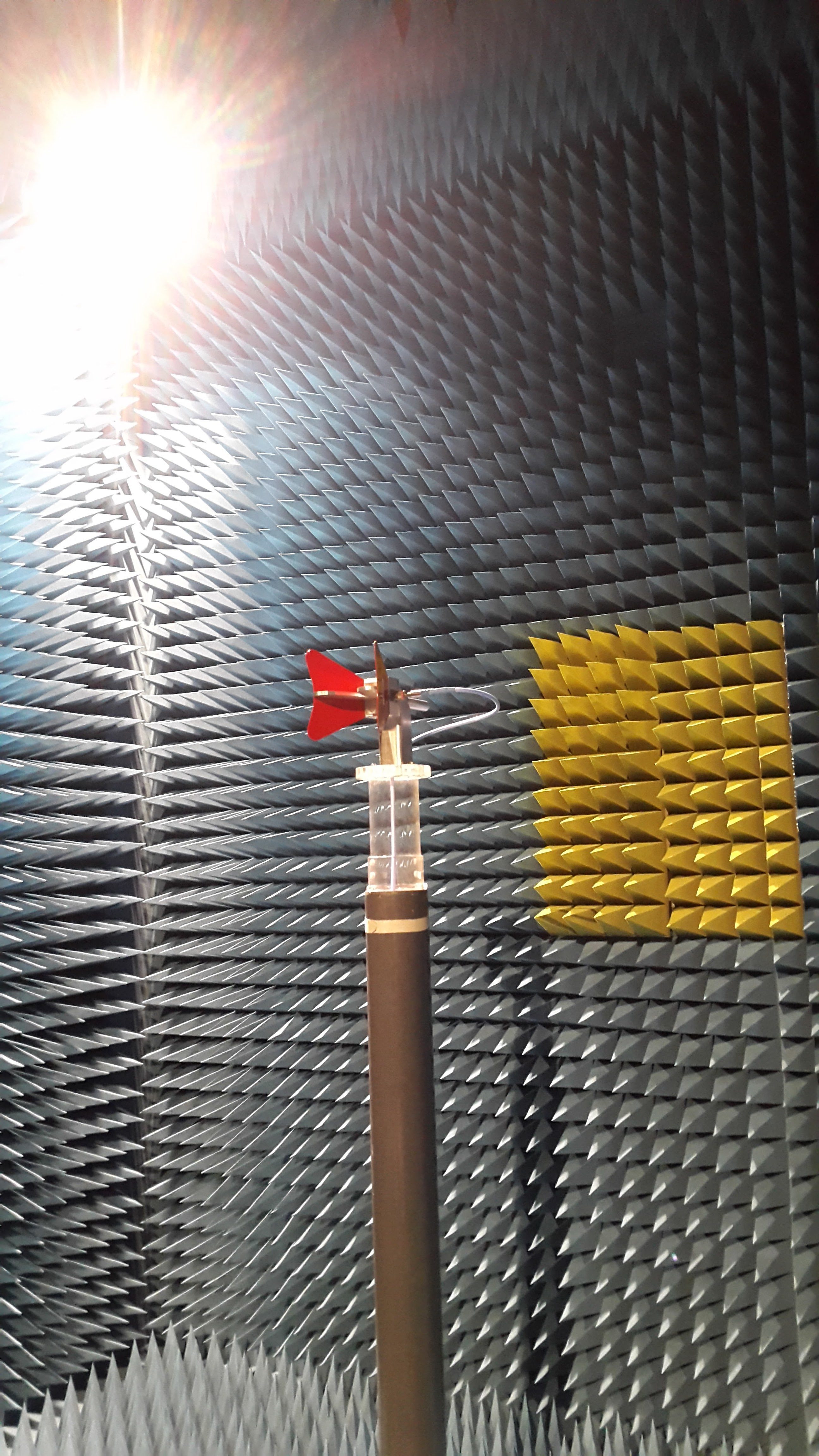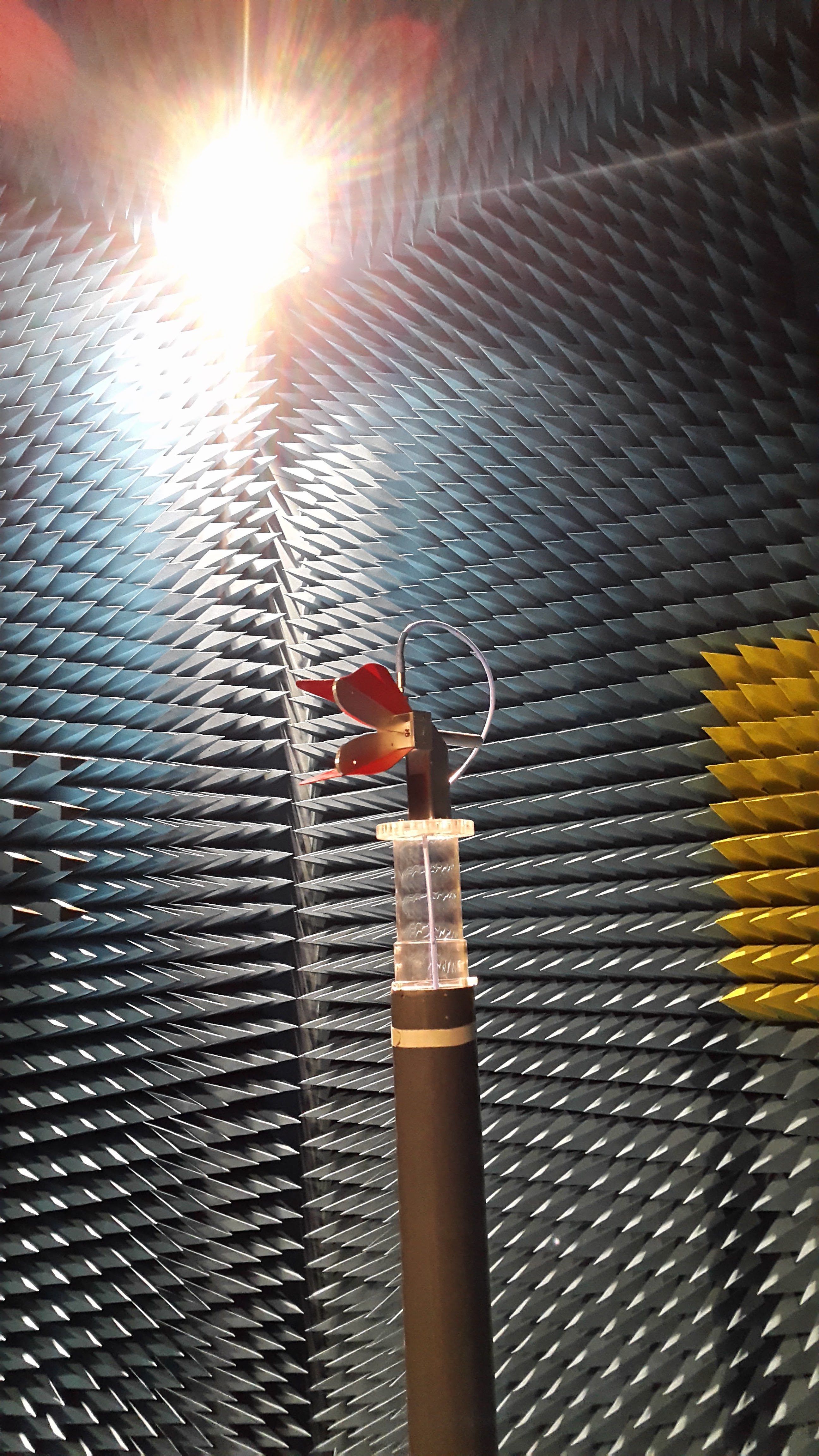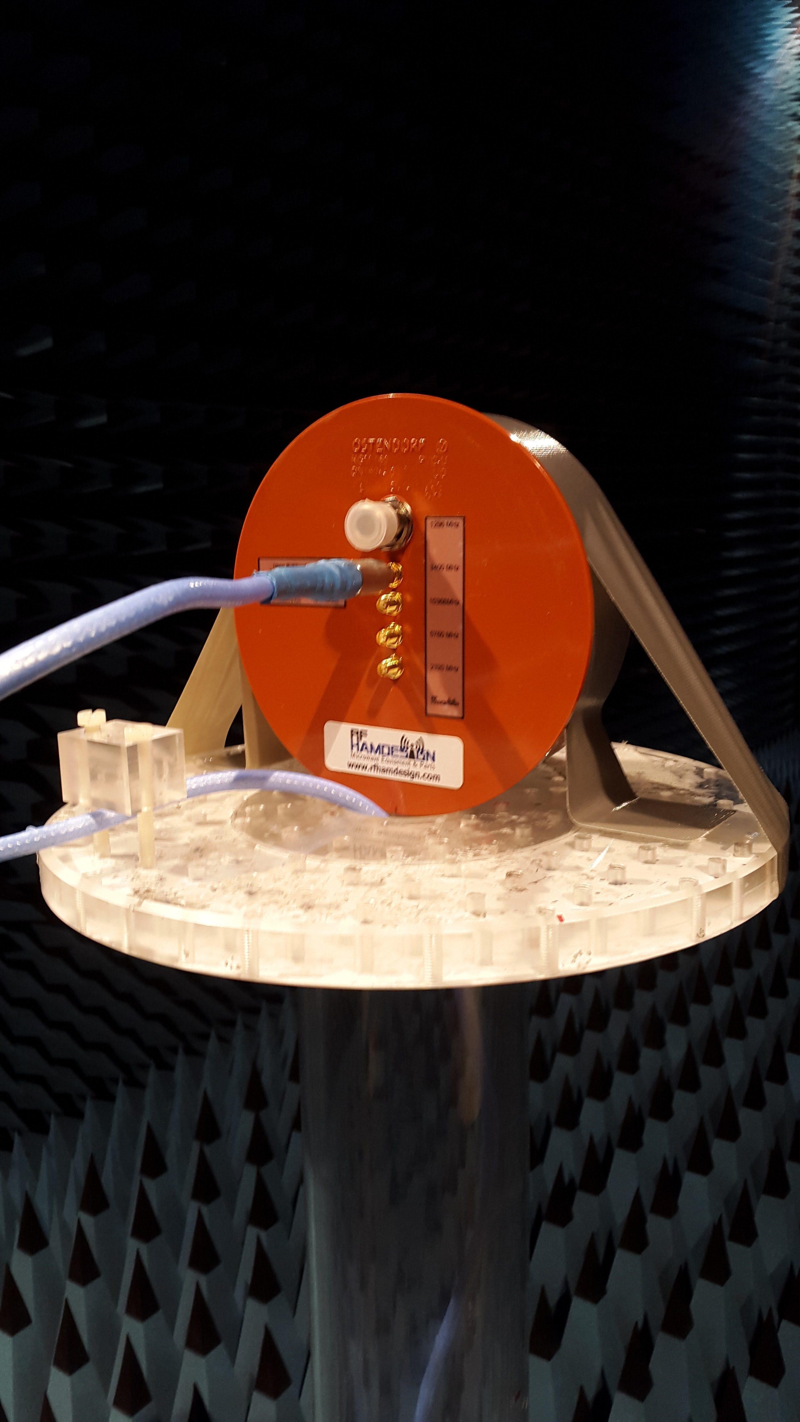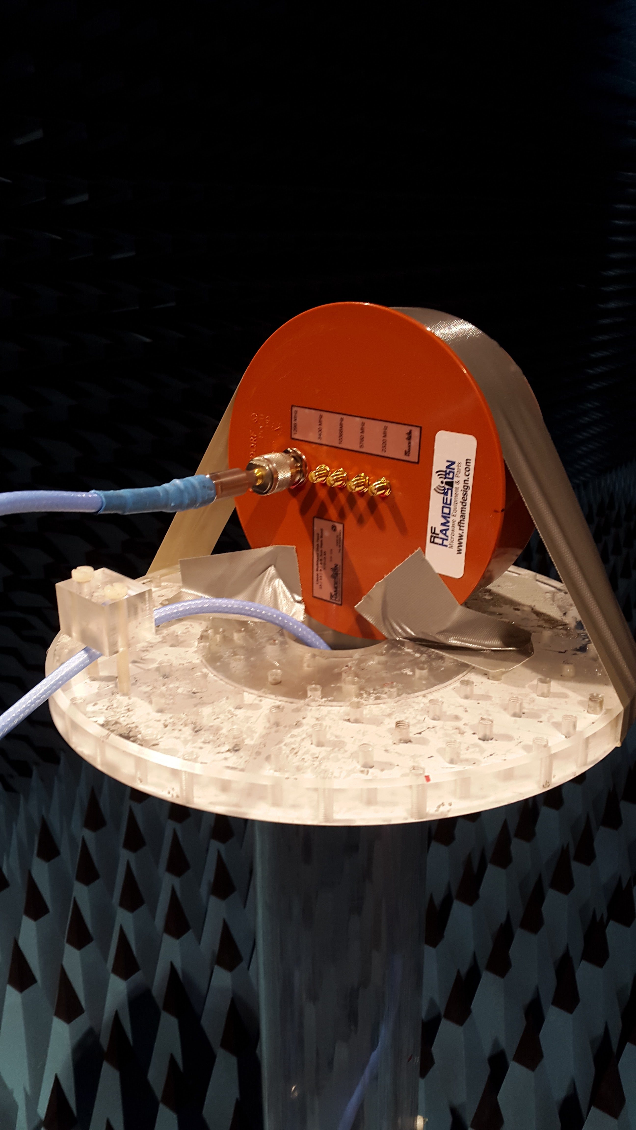 We set up the test using a ETS Lindgren Model 3117 horn as the test antenna. The pattern is measured by turning the Device Under Test (DUT)- platform, where the 5 band ring dish feed is placed on in the image above, by use of a mechanical rotor. At each azimuth point a network analyzer measures the isolation between the test antenna and the DUT-antenna. Once the DUT has turned 360 degrees a relative pattern is derived.