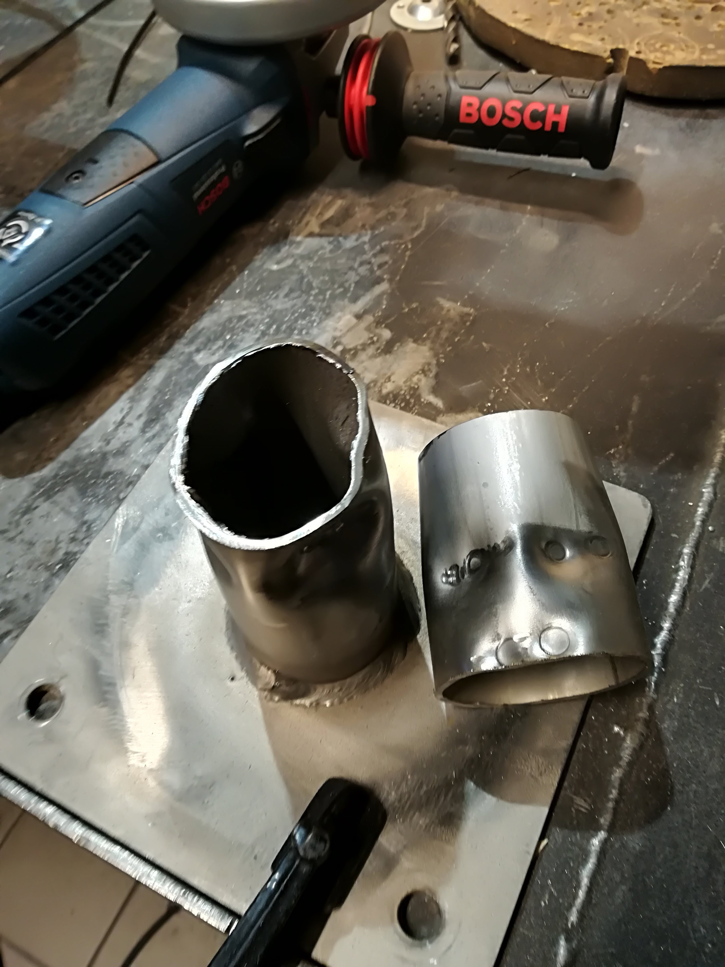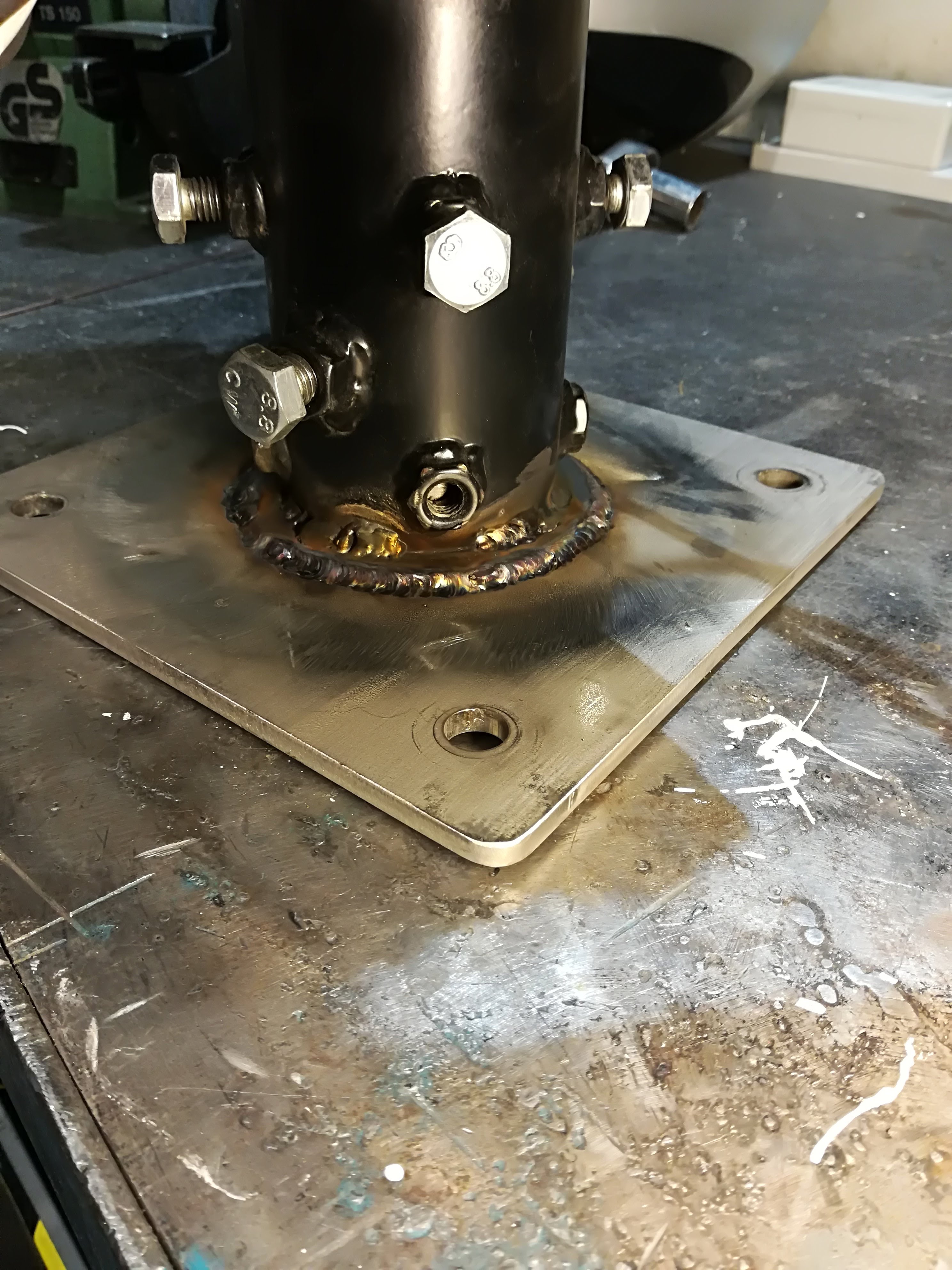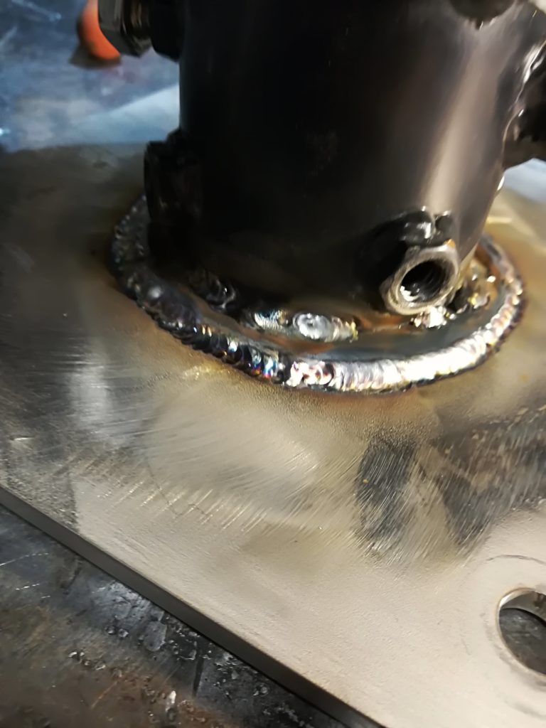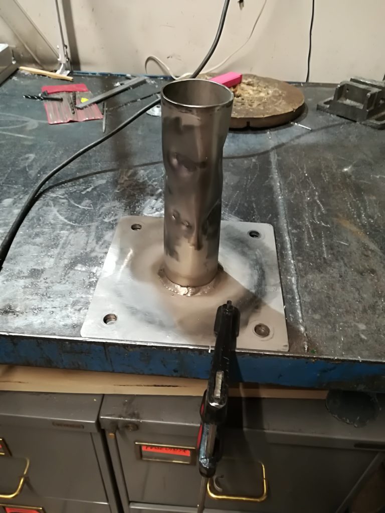 - LB7IG performing the welding. The circular flange welds are reinforced with additional welding points. Then the circular flange is welded to the larger square flange.
