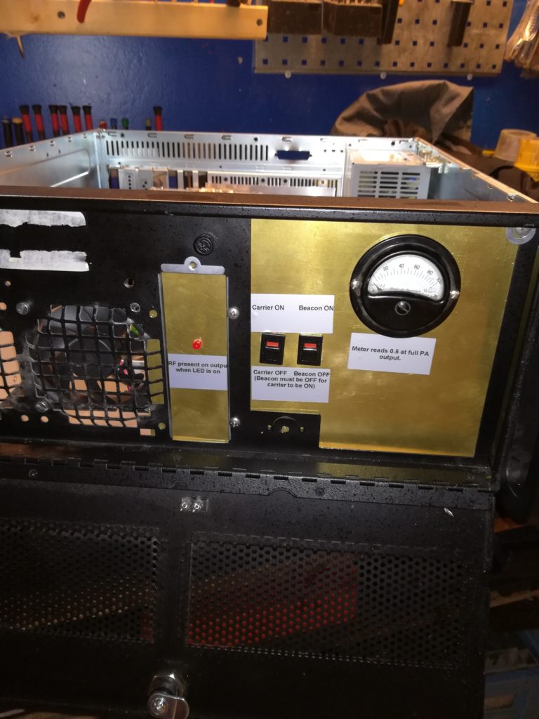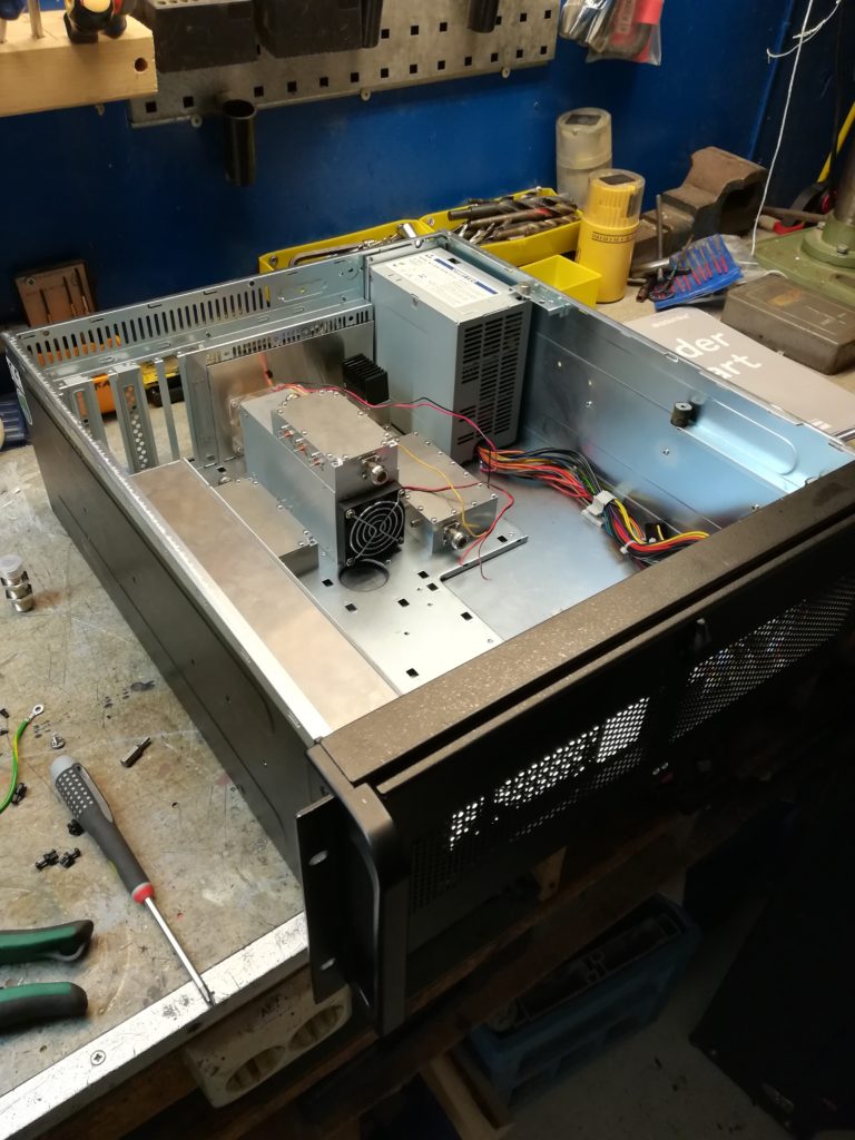 The most time-consuming stage was integrating all the components inside a chassis. At Vassfjellet, the other beacons are mounted in a 19″ rack, so we needed something that would fit in there. Luckily we had a surplus computer cabinet that was up to the task. Most of the work here consisted of drilling and tapping holes, and hooking up wires to all the parts.