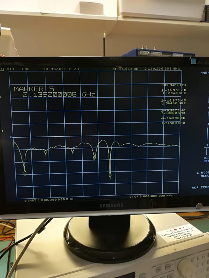 S11 for the antenna before finding the proper distance to the ground plane. Note: the expected center frequency is 1550 MHz.