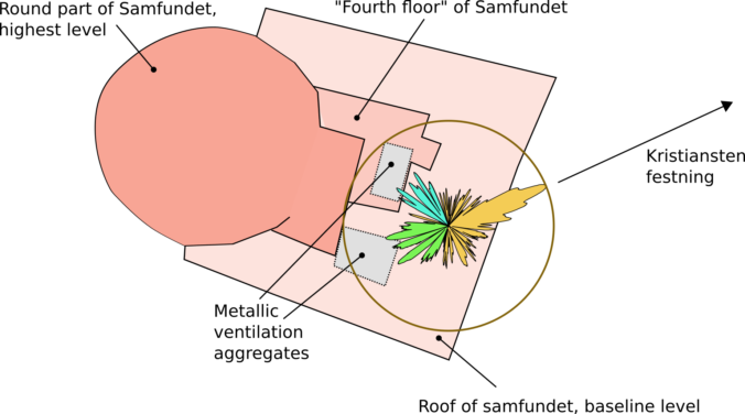 Positioning of the center of the antenna pattern in the approximate location of the parabolic dish, in relation with a rough outline over the Samfundet building. Parts of the antenna pattern we believe are due to reflections against their respective ventilation aggregates are marked with blue and green.