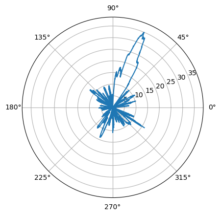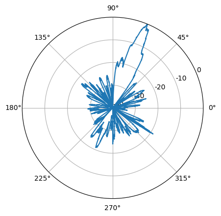 plt.polar(azimuth*np.pi/180.0, power)