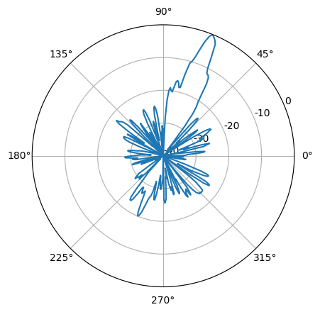 However, since the power here is calculated without a real reference, and since there will be arbitrary negative values which the polar diagram can’t handle, we have to do some additional steps in order to get something which can be interpreted. It is customary, for example, to let the maximum power have value 0 dB, and let the rest of the distribution take negative values from there and down. The lower limit of the polar diagram should be -40 dB. We achieve this by manipulating the power array a bit and changing the axis values: