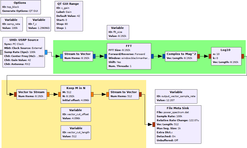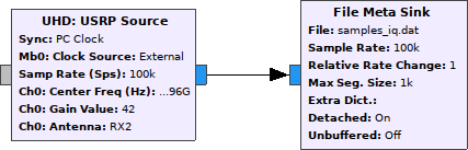 We also make sure to calculate the correct rate change for the file meta sink, since the sample rate for the vectors in the vector stream will be different from the sample rate of the individual samples. This will ensure that the rx_rate tag in the output file will correspond to the rate of the vector elements, and not each individual sample, which makes life slightly easier in the off-line analysis end.