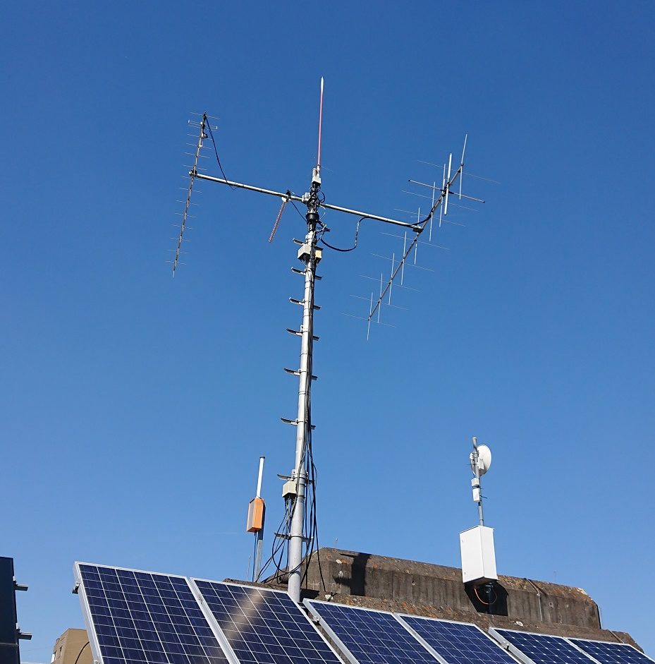 HF Yagi antennas at AkaFunk. Left one is for 20 m, right one is for 10 m-17 m. There are also wire-dipoles hanging over the university backyard.