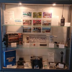 As DL8BJS was quite fresh in the club, having joined only a few months prior, we had some problems getting into the university building. After a while of looking for a door that would be open for students on a Sunday, we managed to catch a university employee who was kind enough to let us in. One of the first things meeting us as we got closer was a small exhibit of amateur radio equipment. This was a nice nod to the clubs history, and serves a nice presentation of the amateur radio hobby to anyone who might pass by.