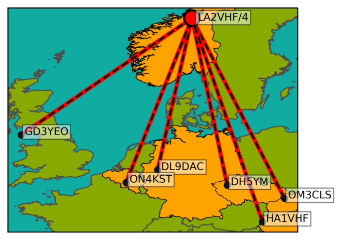 LA3WUA Øyvind came to me late Monday evening last week, desperate, wanting a map to visualize the calls which had spotted our 4m beacon, LA2VHF/4. No problem, Øyvind. 8). Here is also a post describing how it can be done, so that you can do it yourself the next time.