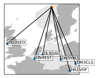 The problem at hand is to visualize contacts that have spotted our beacon on a map in order to visualize propagation. The solution here can be considered a follow-up to an earlier blog post, Plotting Norwegian ham radio contacts on a map using Pandas, Cartopy and Geopy, where we plotted Norwegian calls on a map over Norway. In the current post, this is extended to European contacts.