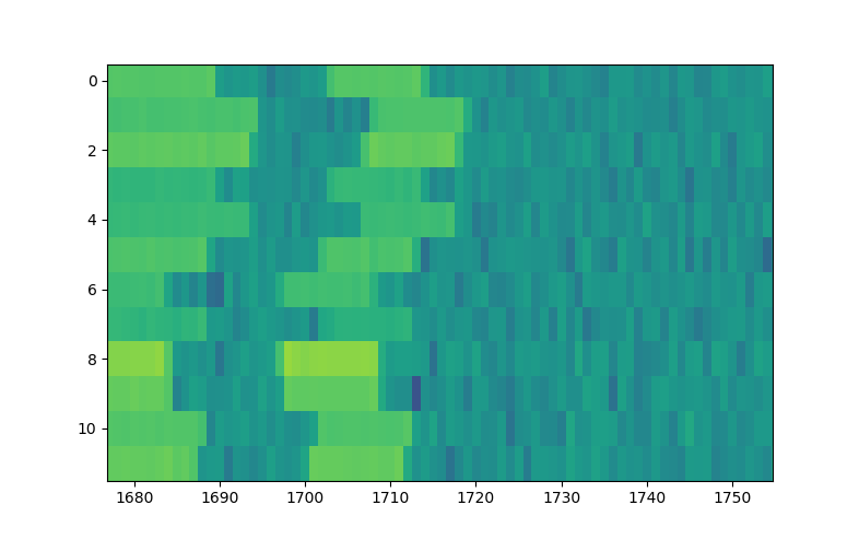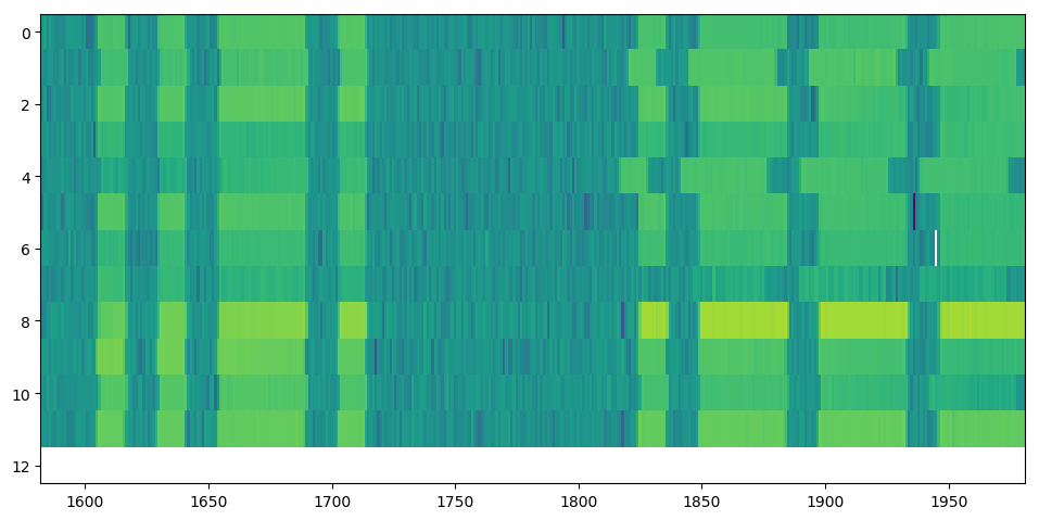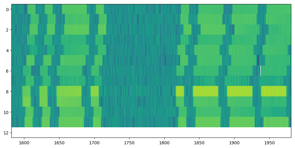 Plotting the sequences in an image confirms this trend. The first sequence, for example, is shifted to the left with respect to the next sequence for the first 150 samples, but after 2325 samples, it is actually slightly shifted to the right. The same behavior can be seen for the other sequences.
