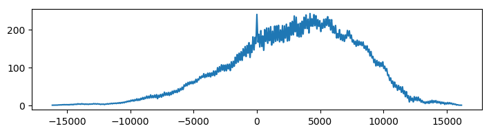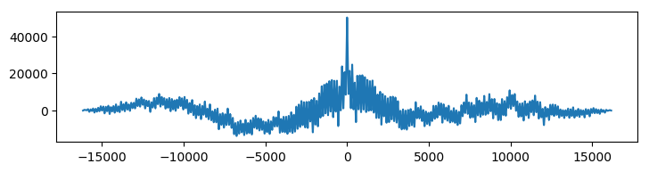 Having taken the logarithm of the signal, the lobes throughout the signal are more comparable against each other, and the main lobe no longer dominates over the rest. This also enhances the noise in the gaps of the signal, which would normally be problematic – but is actually handled very well by the autocorrelation.