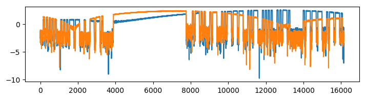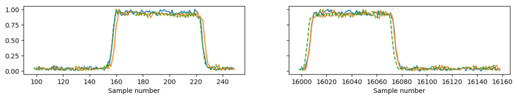 The plot above shows two normalized sequences from two points in time along the sequence. Blue and orange are the original sequences, while green dotted signal is the orange being attempted matched with the blue sequence. For the first part of the sequences, samples 100-240, the sequences are reasonably well matched if the orange sequence is shifted 2 samples to the left. But later on in the sequence, the orange sequence is actually already well matched with the blue sequence, and moving it 2 samples to the left will actually make it mismatch. The timing is actually not consistent throughout the entire signal. We’ve been had!