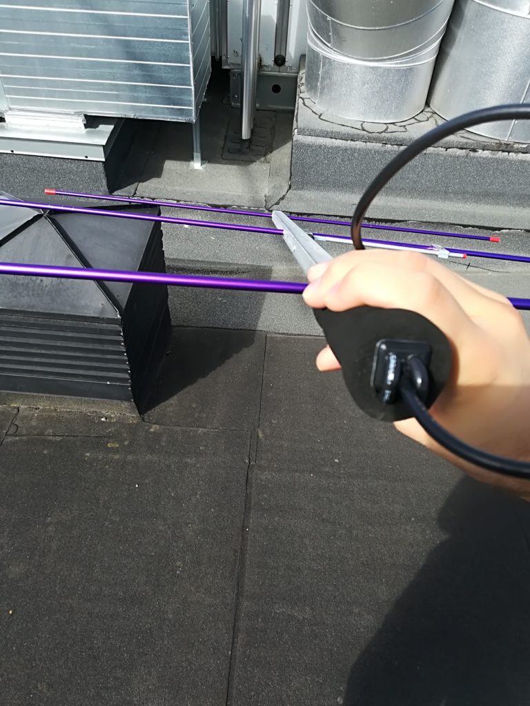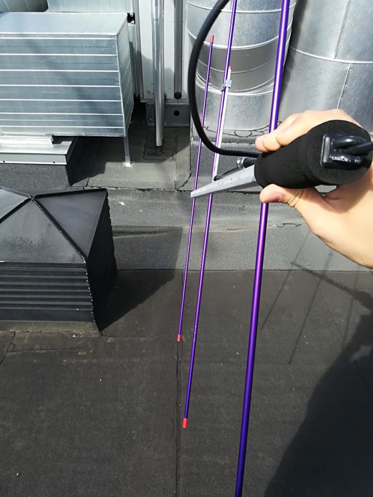 We started on the roof, and tried to locate the noise source(s). The general procedure is to stand in a spot, and then sweep the measurement antenna, an Arrow II yagi in our case, over the area where the noise might come from. The noise can be any polarization, so the user rotates the measurement antenna in order to find noise sources.