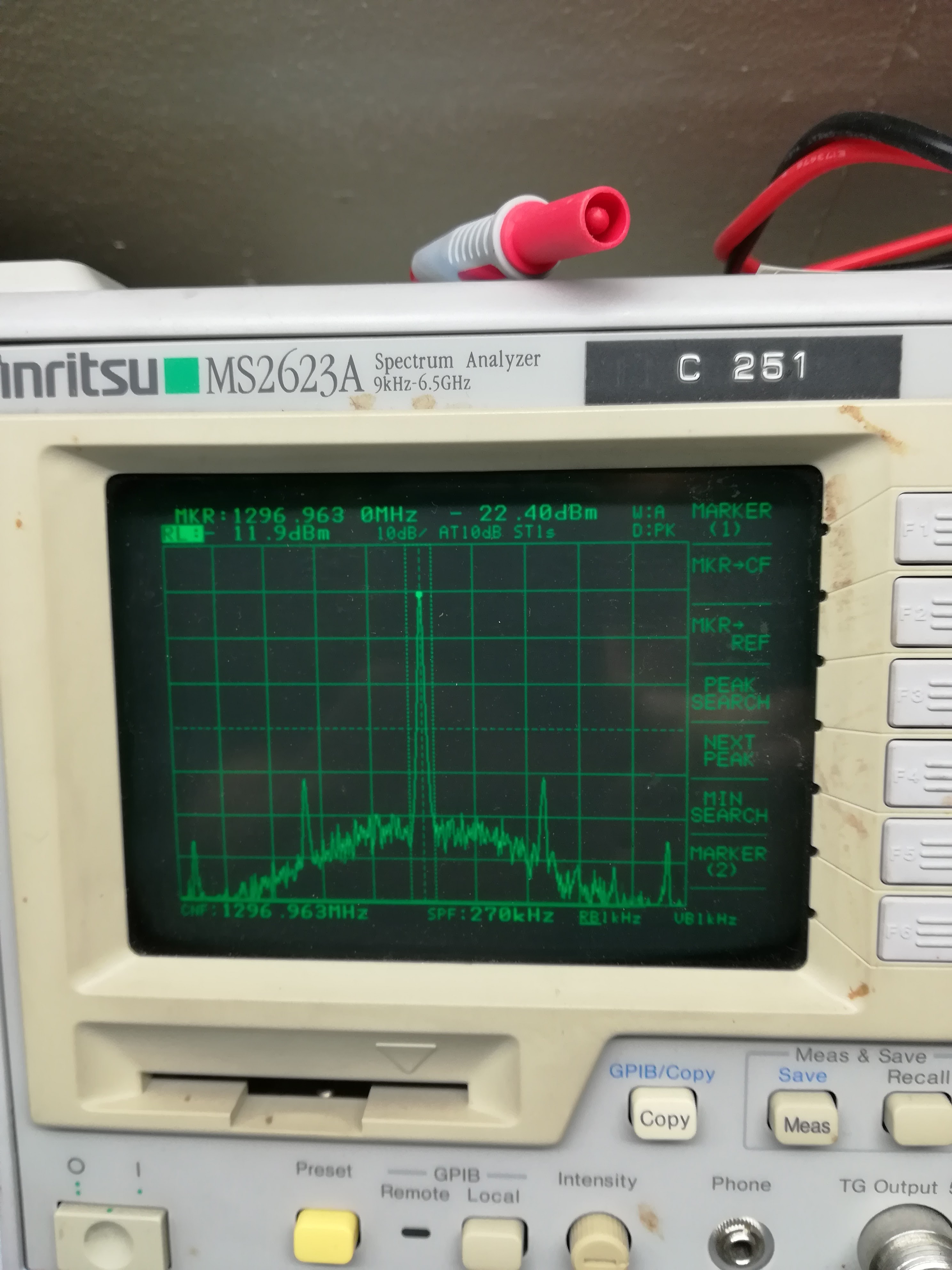 Measurements in the lab, showing LA2SHF in the main, central peak, and its first and second harmonics to the sides. The height of one square corresponds to 10 dB.