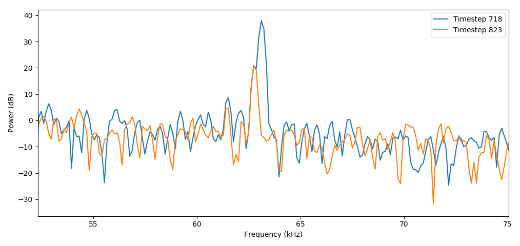 Plotting two timesteps with high and low sidebands shows the variation in sideband strength.