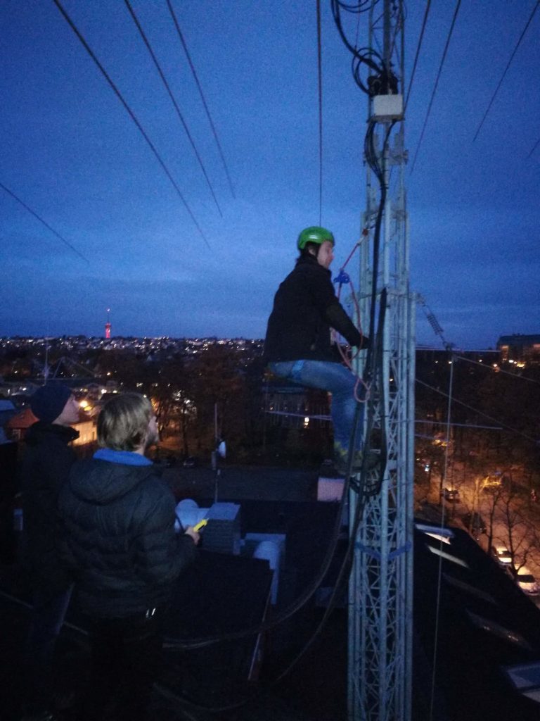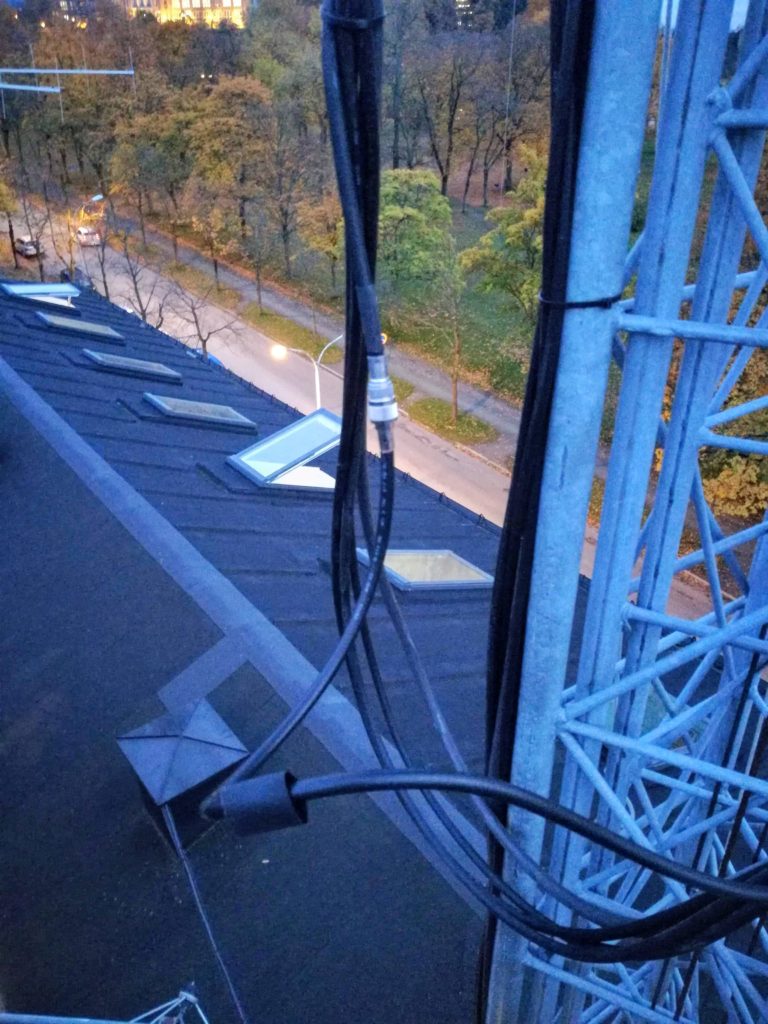 We cut away the damaged section, and spliced the feed with a fresh pair of connectors. There was also some stripped cable further up the mast, but this was only superficial. This will be fixed later with the trusty combo of self-amalgamating and super 88 tape. After measuring the newly crimped cable with our antenna analyzer it turns of that the previously damaged cable actually belongs to the 15/17 m elements of our Force12 5BA HF-yagi. This was very surprising, as we had worked a number of contacts on the broken 15 m cable.