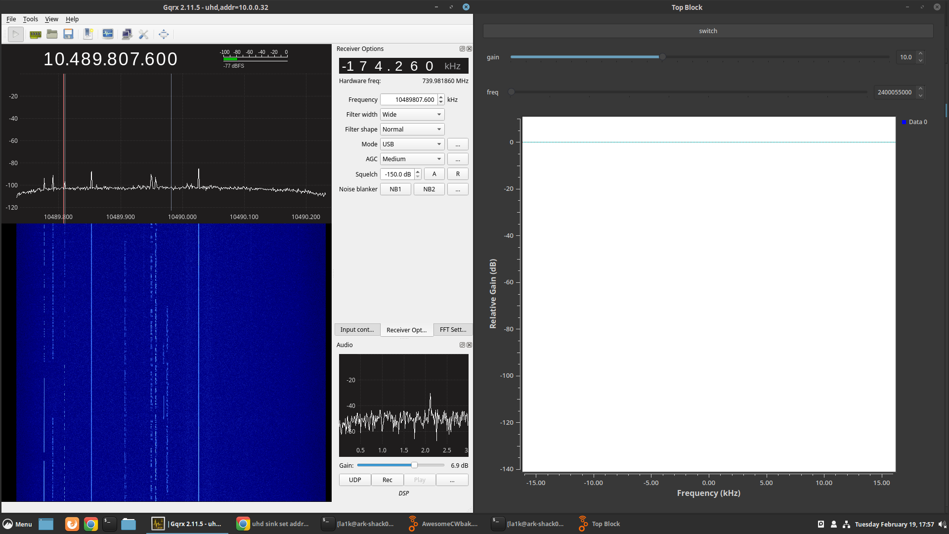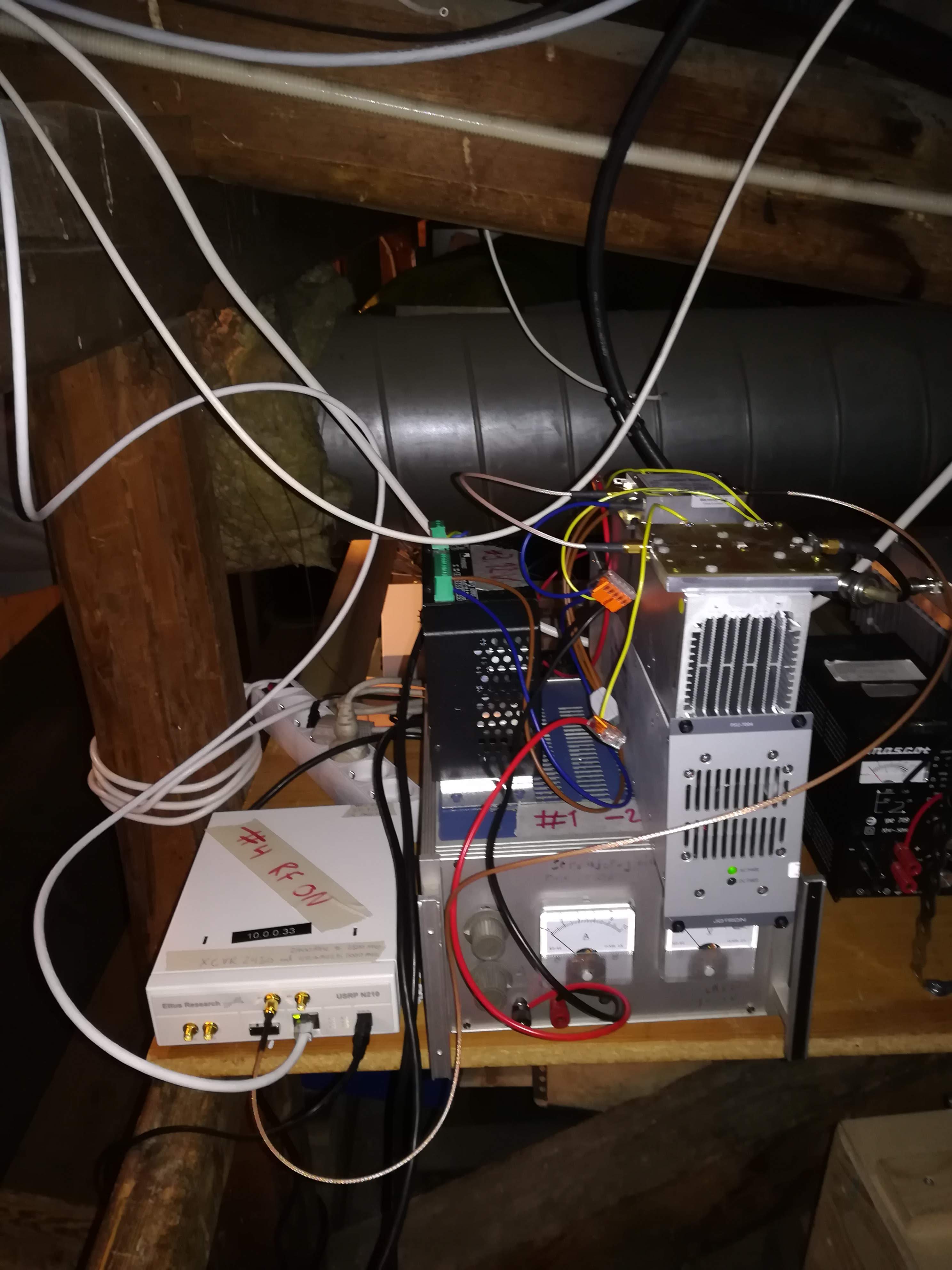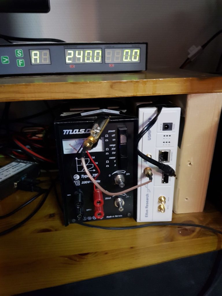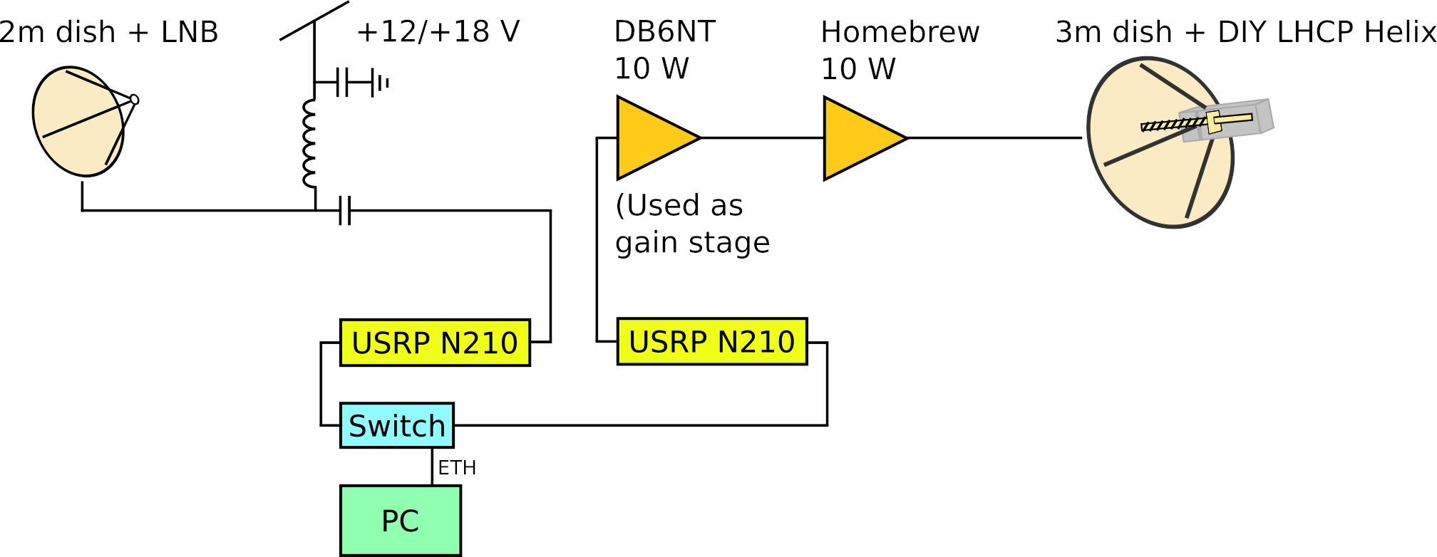 The receive chain is solved by use of a commercial X-Band Low Noise Block Downconverter (LNB), which we placed at the center of a previously erected TV-dish which is no longer in use. We made a DC-injector (details about this can be found in this post) to be able to provide the LNB with the 12 V / 18 V it needs over the coaxial cable. Inside our shack we placed a lab supply along with a USRP N210 with a WBX-40 daughterboard. This serves as our receive chain, which we are able to access using the GQRX software provided by OZ9AEC.