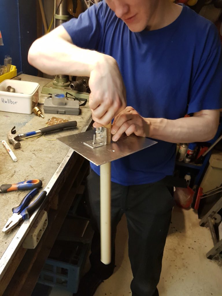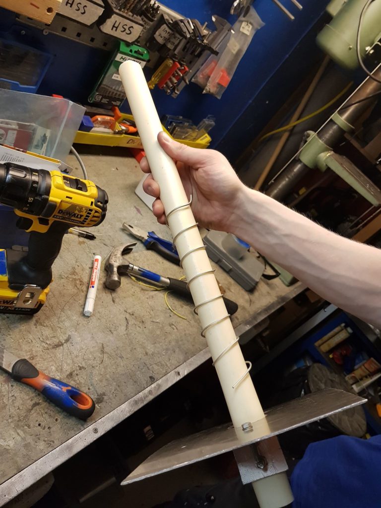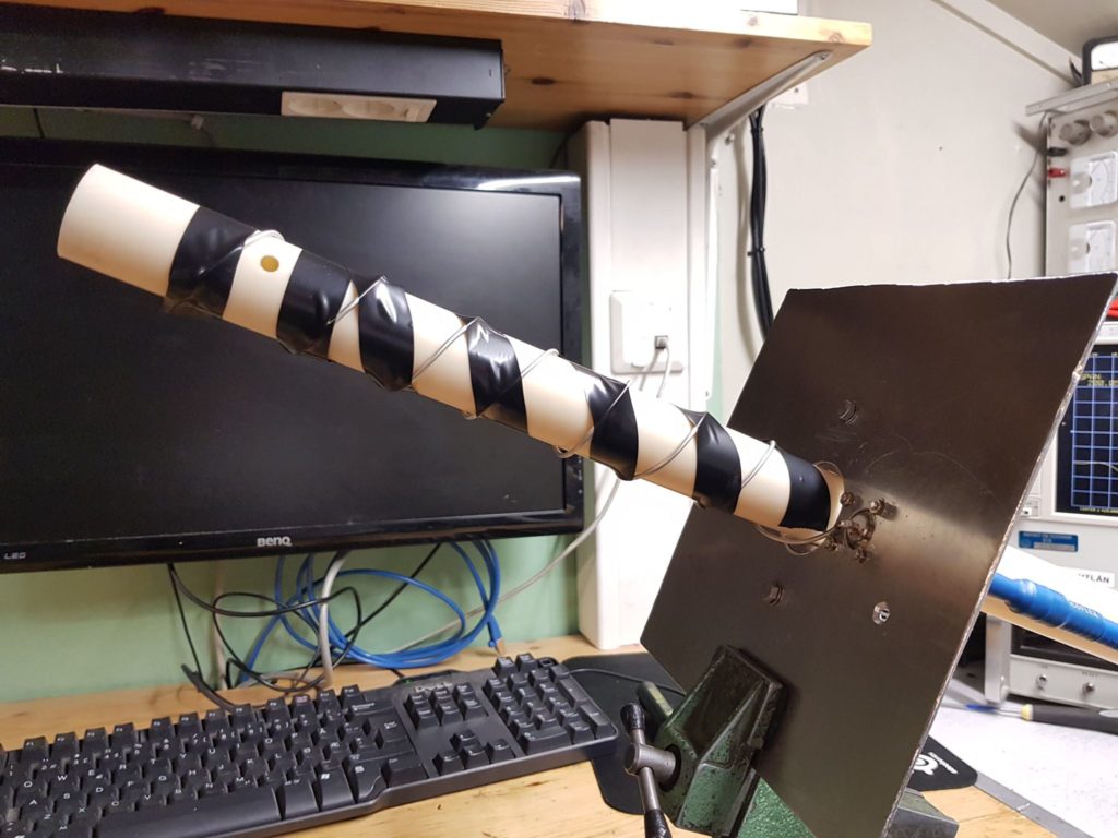 Instructions for the helix were found on this collective article on qsl.net. We made some modifications to fit our requirements. Most notably we only used 7 turns, and we also went for a simpler matching structure. Our matching structure was originally intended to be a quarter-wave transformer using the first part of the helix, but it turns out that in our particular case best match was achieved without any matching structure at all :D.