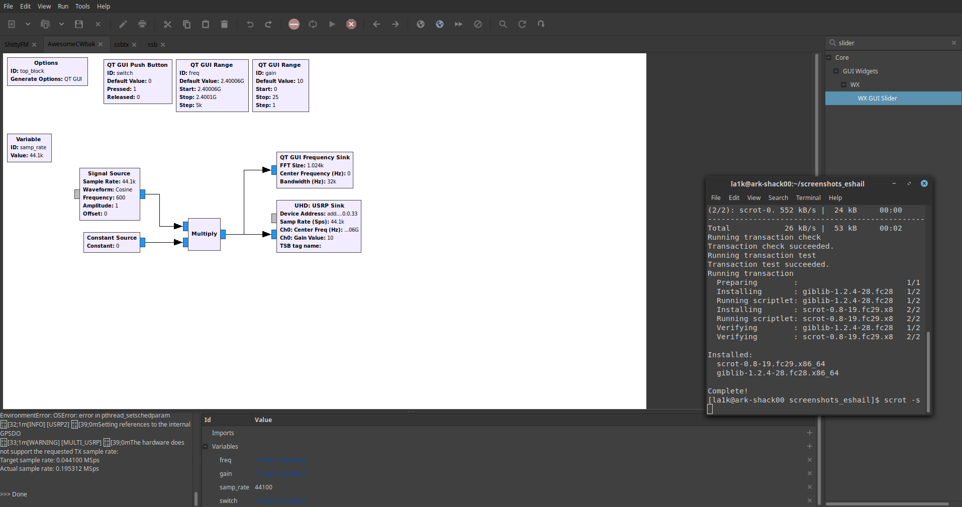 With both RX and TX chains in place it was time to test the system. After brushing up on the operating guidelines for the narrowband transponder, we were ready to attempt the first QSO. We had some trouble creating a good SSB transmitter within GNU Radio, so we ended up working the first QSO using a very rudimentary CW transmitter.