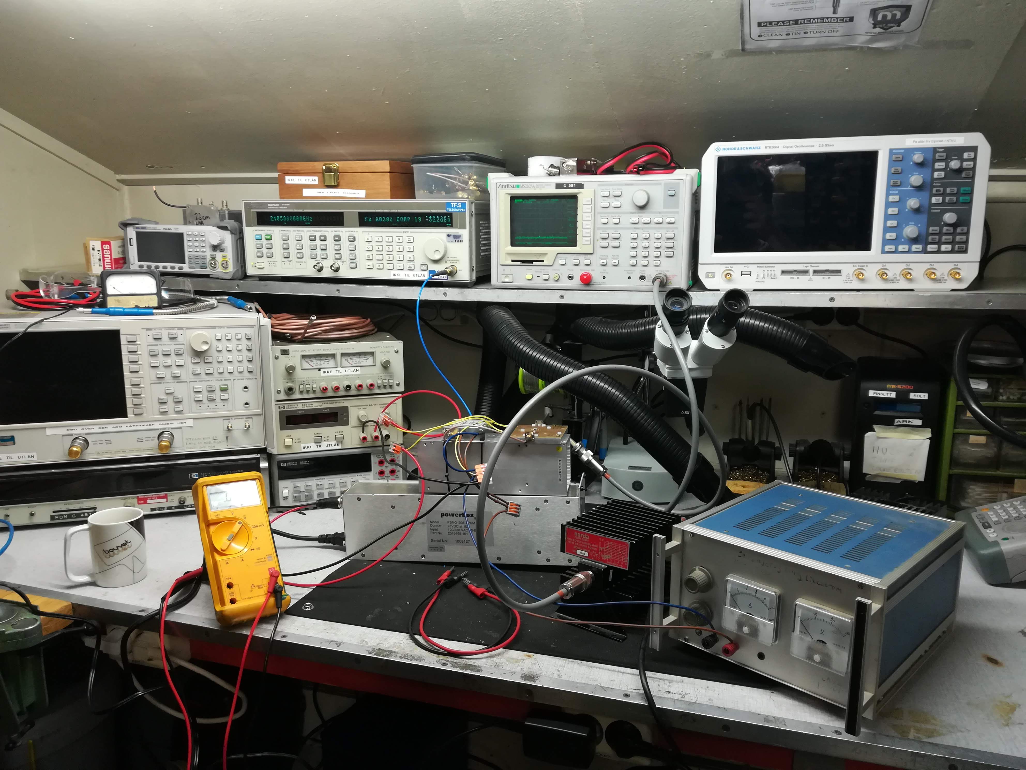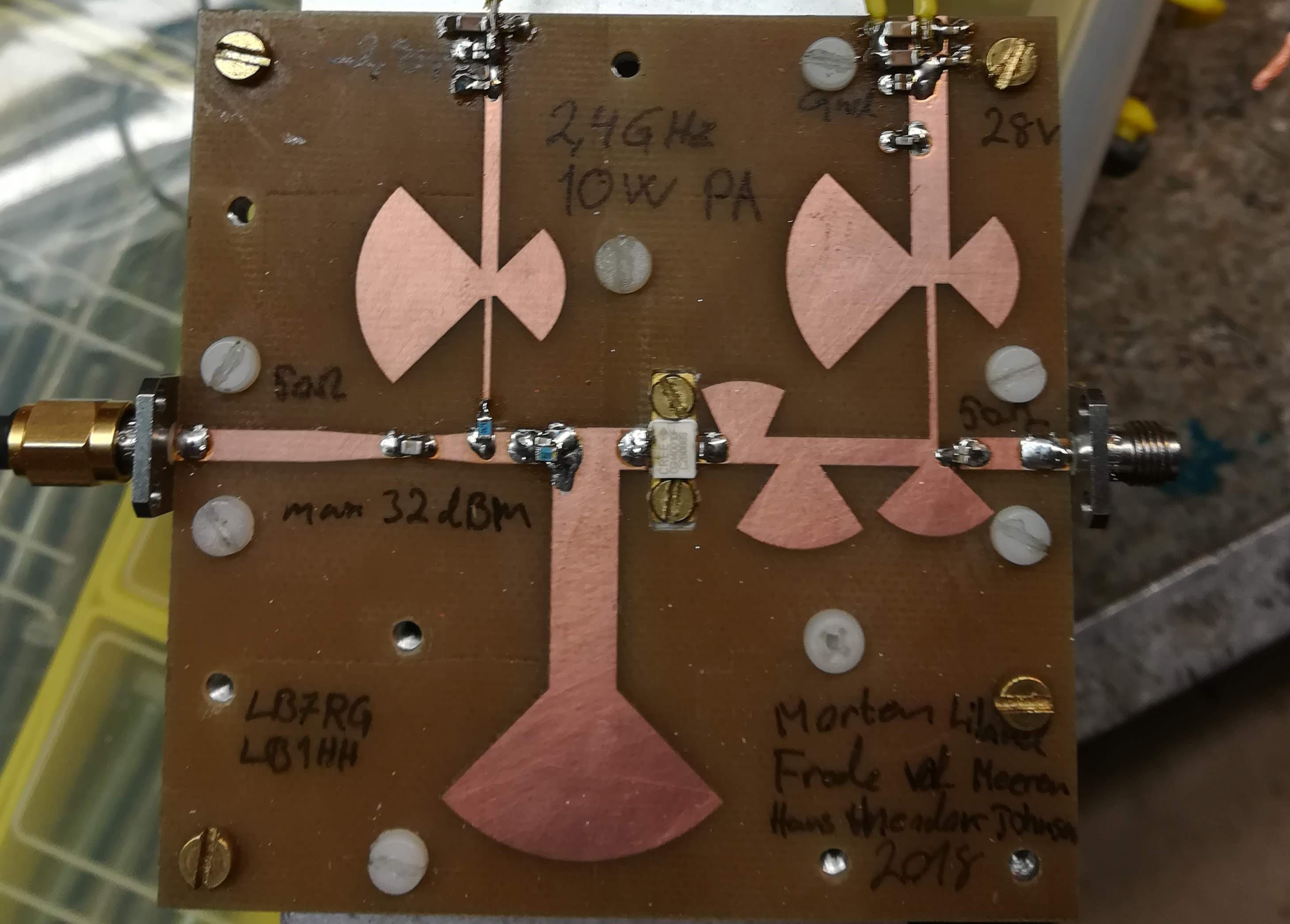 Quite regularly, LA1K members attend a course at NTNU where the semester project is to design a 10 W 2.4 GHz amplifier. These tend to be a bit funky, as they are usually rookie designs. In particular, they sometimes like to oscillate fiercely. Our amplifier drawer housed a promising specimen from a previous student project in this course. It looked to be adequately decoupled, which hopefully should keep it well-behaved.