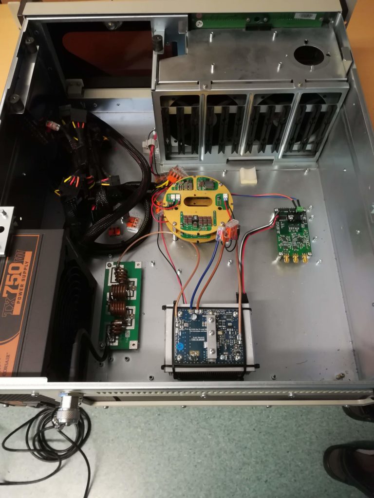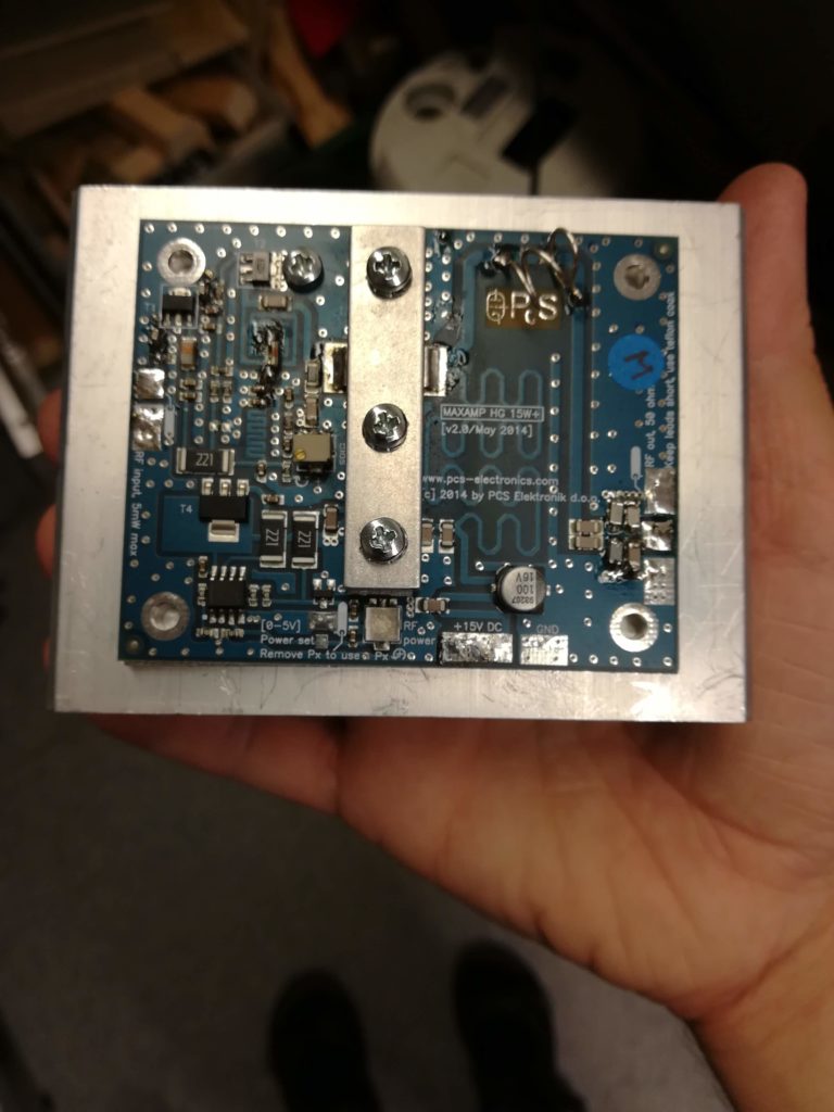 The amplifier was a bit harder to find, as a lot of gain is needed to be able to go to 25 W from the 10-70 mW the CW beacon delivers. We reached out to PCS-Electronics, a store that sells various FM and TV transmitter equipment. They have a “High gain” pallet, which can be ordered for specific frequency ranges if you get in touch with them. This turned out to be a very economical solution, and we ended up paying 99,- EUR for a custom tuned amplifier. They also shipped the device very quickly, and we can absolutely recommend them for other projects.