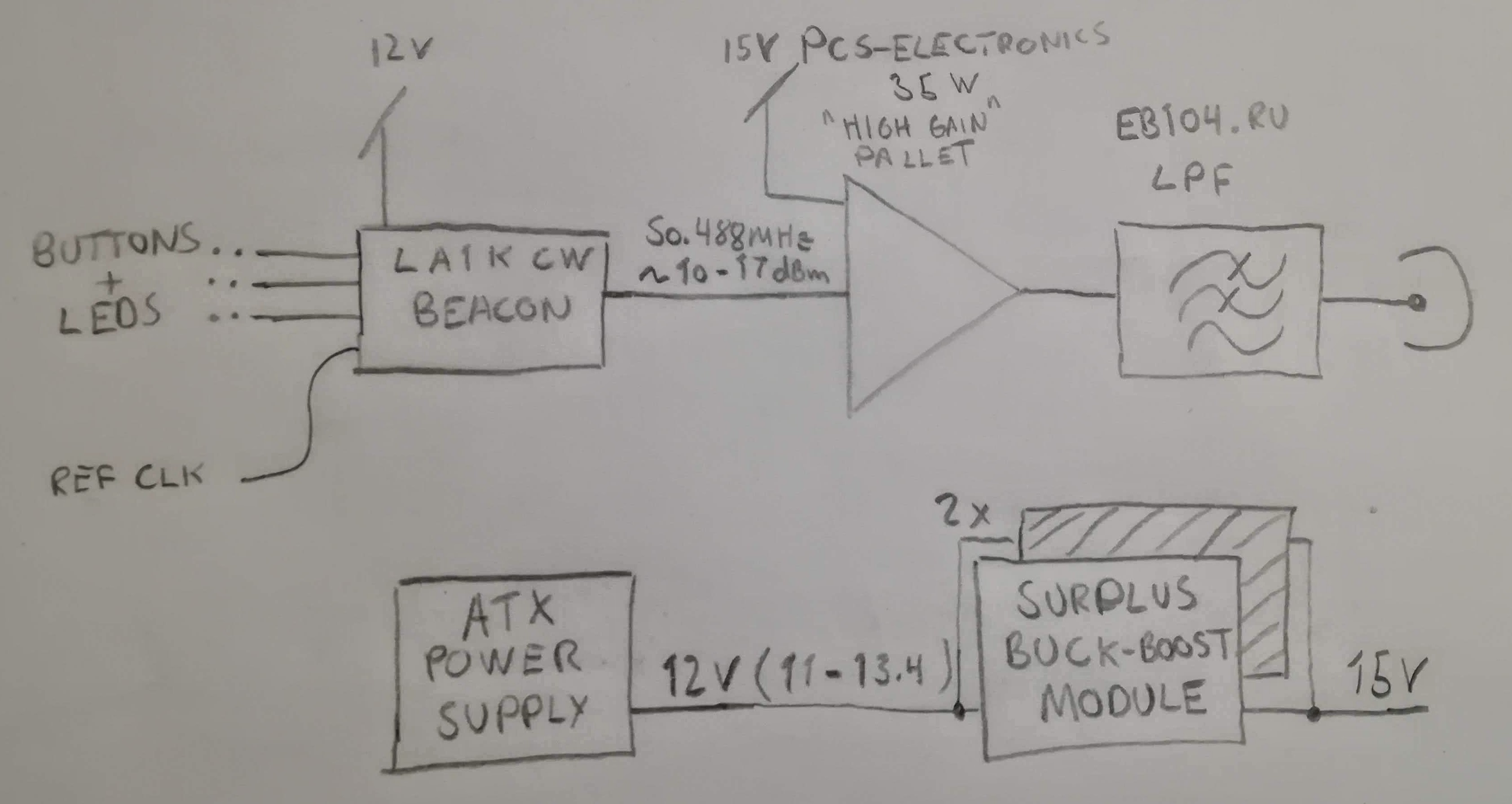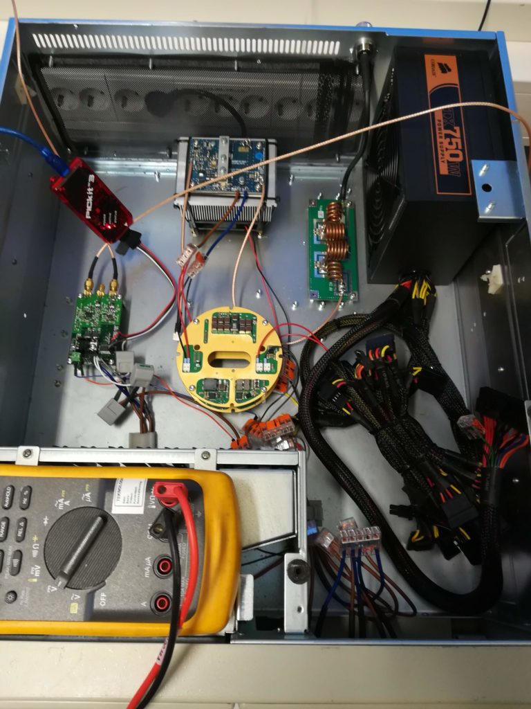 +15 V is supplied via the buck-boost boards seen in the middle of the beacon (a stack of two circular boards). The amplifier would probably work fine from 13.4 V from the ATX supply, but we wanted to squeeze a bit of extra power out of the device. Actually we’re running the amplifier with a good amount of back-off, so this might seem a bit weird – but the main goal is to increase device lifetime. Also, the buck-boost modules help clean up the signal a little.