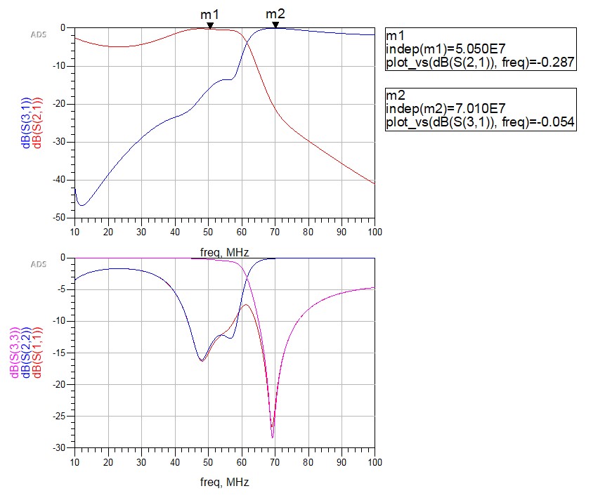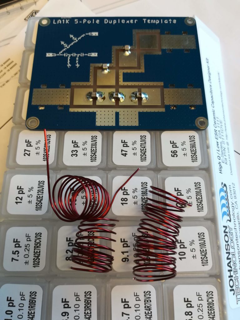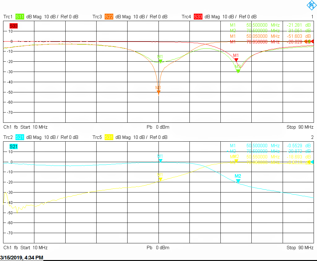 We populated the PCB with component values tailored for our 4m and 6m beacons. This is seen below. The realized board gives about 0.3 to 0.5 dB loss, and has excellent match for the desired band. Some tuning, i.e. pulling on the inductors, will probably be required for optimal performance.