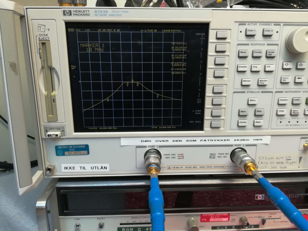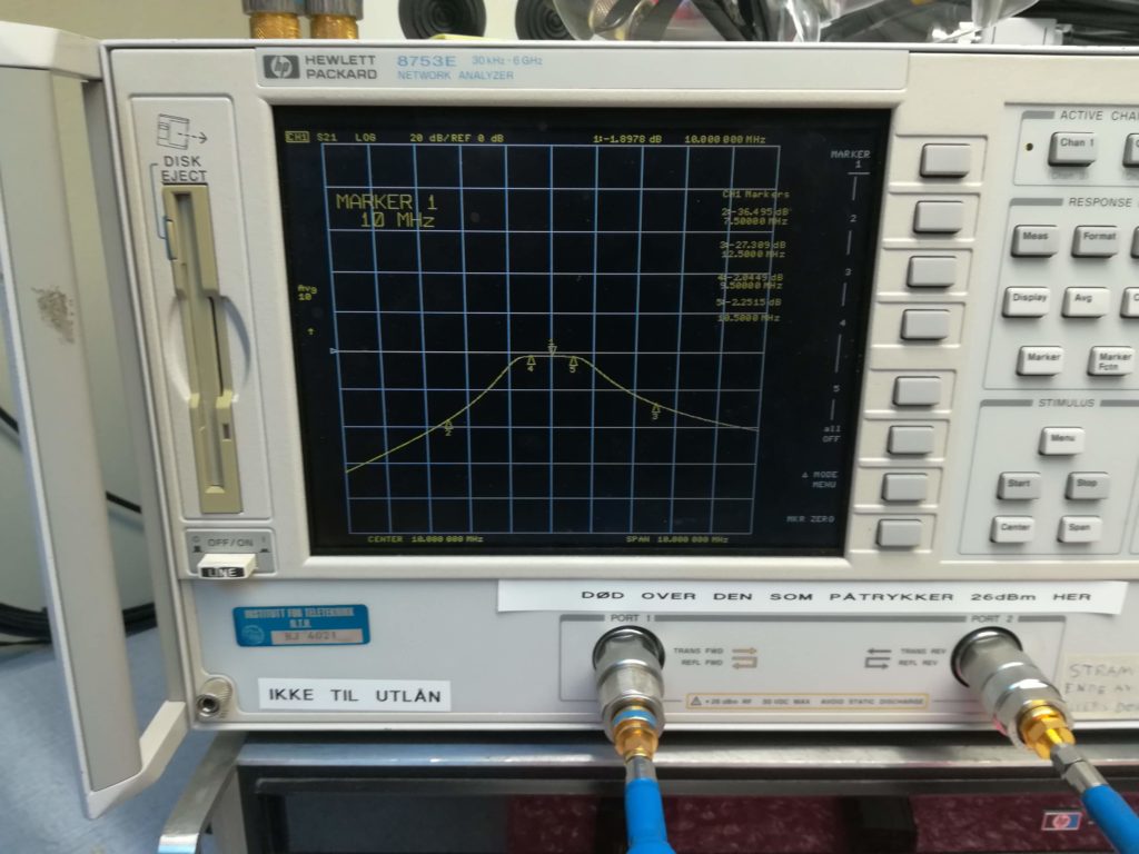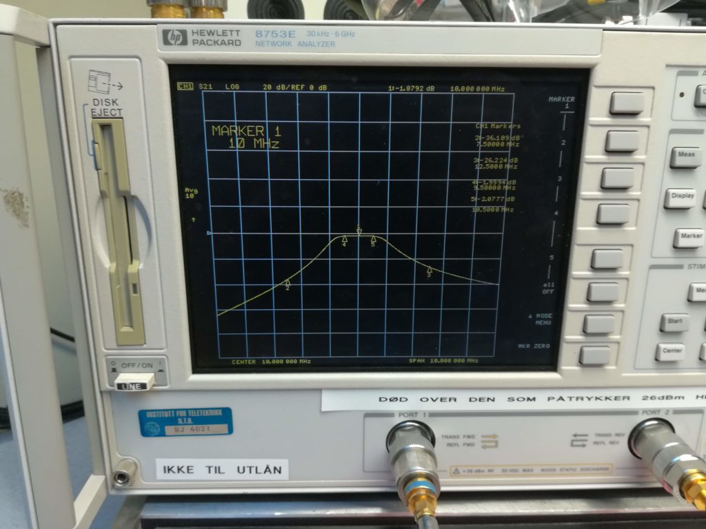 Since we bought three filters, we also had the opportunity to check for batch differences between the samples we had gotten. In short there were little to no difference between the samples, which the photos of their pass bands from 5 to 15 MHz (seen below) illustrate. The measurements are within the repeatability network analyzer, so things are pretty closely tuned.