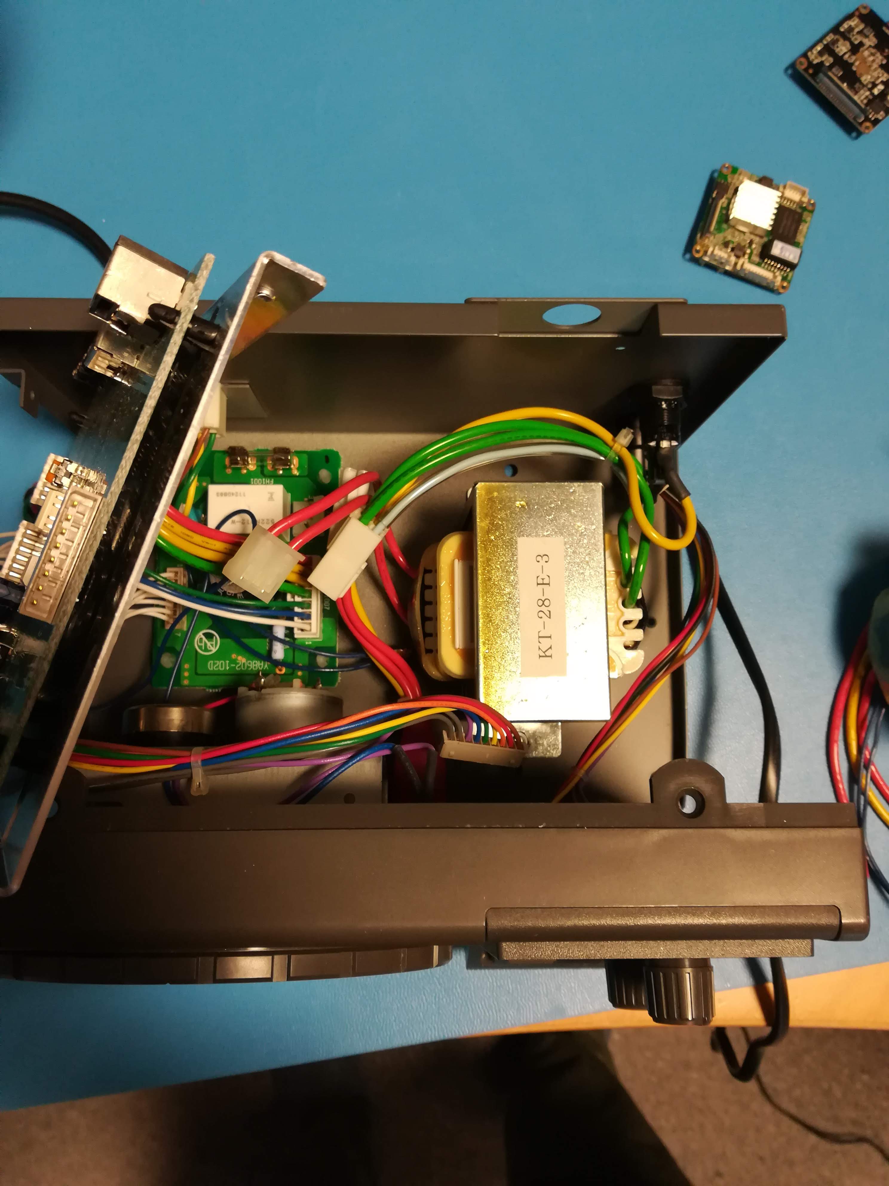 The transformer is accessed by removing the top lid and the electronics board. These are fastened with screws on the upper back of the rear panel and the front of the top panel. Further, the connectors to the electronics board must be temporarily detached.