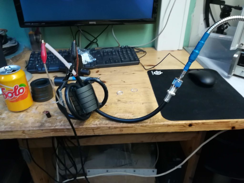 For 15 m, we swapped the coaxial cable for a new one. On 40 m the broken part turned out to be the balun. We did not have a new one available, but we did have some coax and a number of FT240 toroids of an unknown mix (probably #31 or #43). Some hack-and-slashing later, we had a balun that measured OK on our VNA.