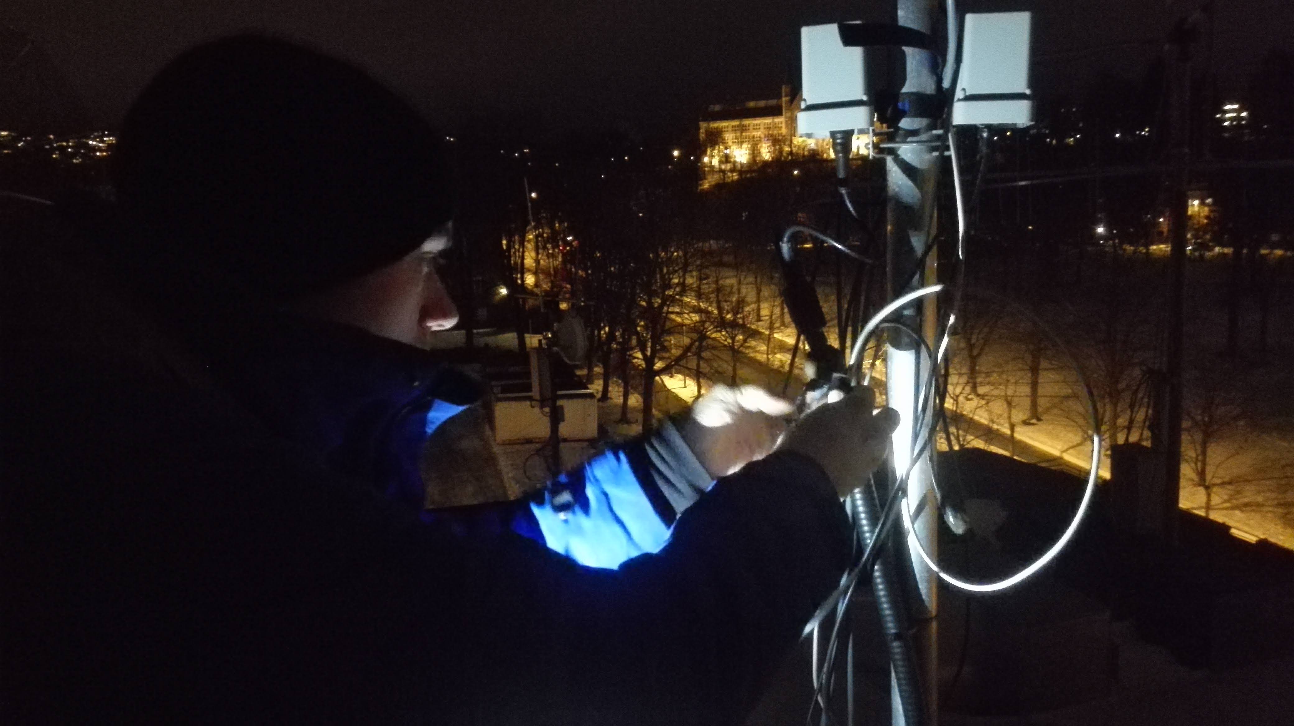 The relay of the LNA said *click* when Øyvind hooked it up, and he told me that this was a good sign. After having wrapped up the cable bundle in tape, the LNA made several more clicking noises every time he touched the cables. Is this a good sign, too, dad? Øyvind was silent as to whether this also was a good sign.