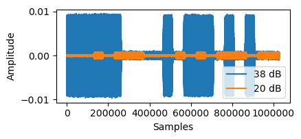Increasing the gain increases the SNR, which we can see by the increase of the ratio of the LA2UHF beacon amplitude to the noise floor amplitude (which could be a nice thing for improved reception). This also increases the amplitudes, which could be a nice thing for the int16 conversion.