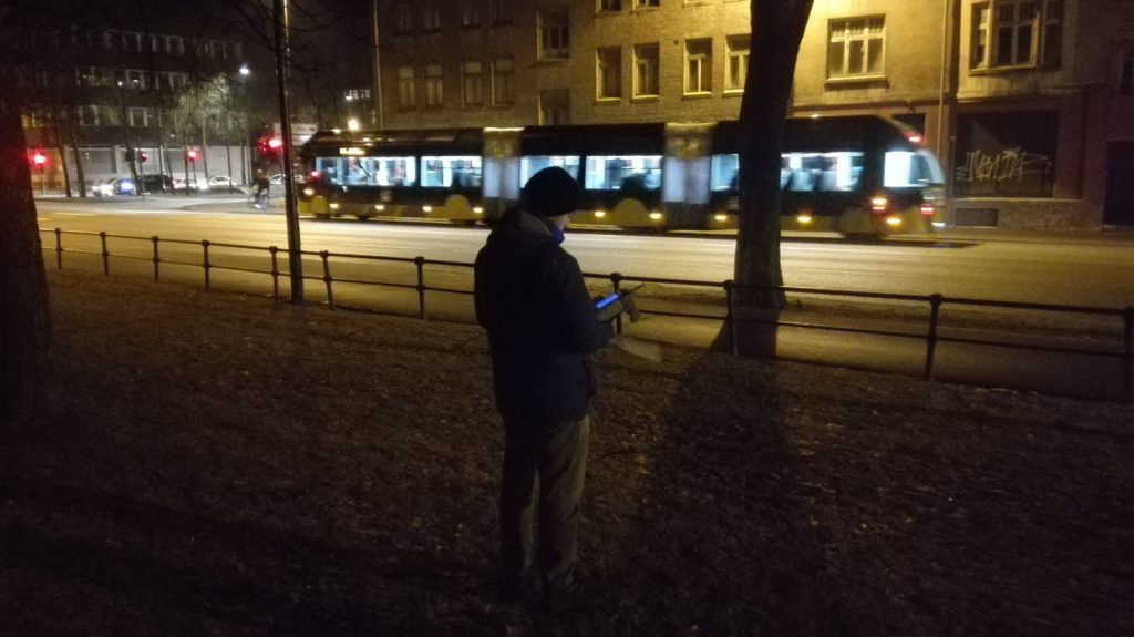 LA1BFA had noticed that the squelch on his 2m radio would sometimes open when he drove by a metrobus. LA3WUA took responsibility and went to Høgskoleparken in the darkness in order to point his antenna towards buses and do some noise measurements. (The author of this blog post was also forced outside in order to provide photographs.)