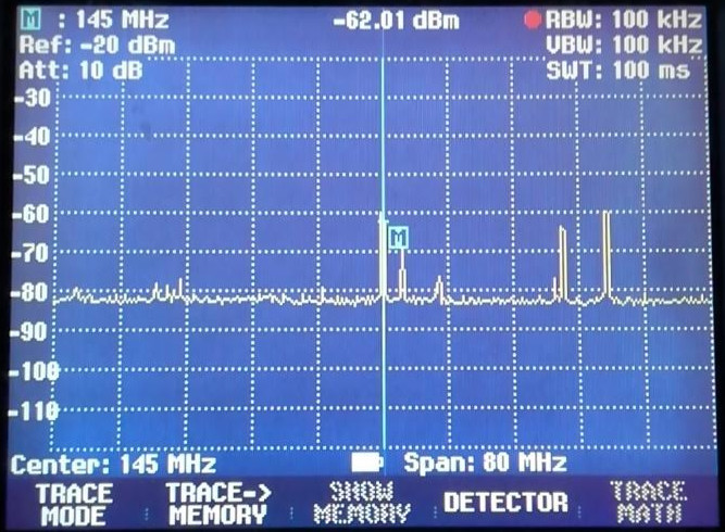 The span is 80 MHz since we didn’t know what to look for in advance, so it doesn’t really give a good impression of the nature of the noise. We therefore limited the frequency range and did another measurement at vertical polarization: