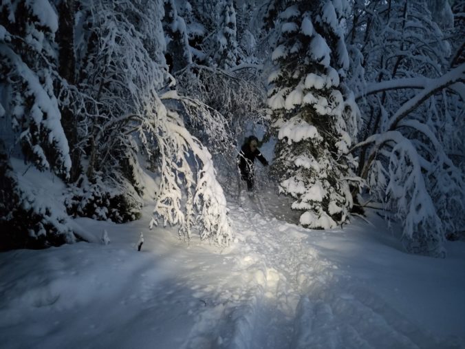 This turned out to be a recurring theme during this trip. We had to shake the snow off many trees to clear the narrow path. The deep snow, together with the trees, made the experience nearly magical.