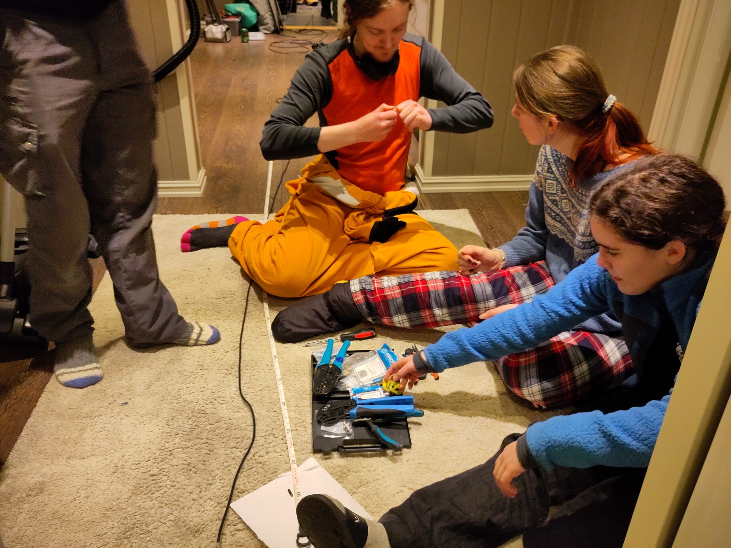 Measuring up the lengths of coax to unshield. From left: Tiril, LB0CJ, Ola and Emma. Photo: LB5DH