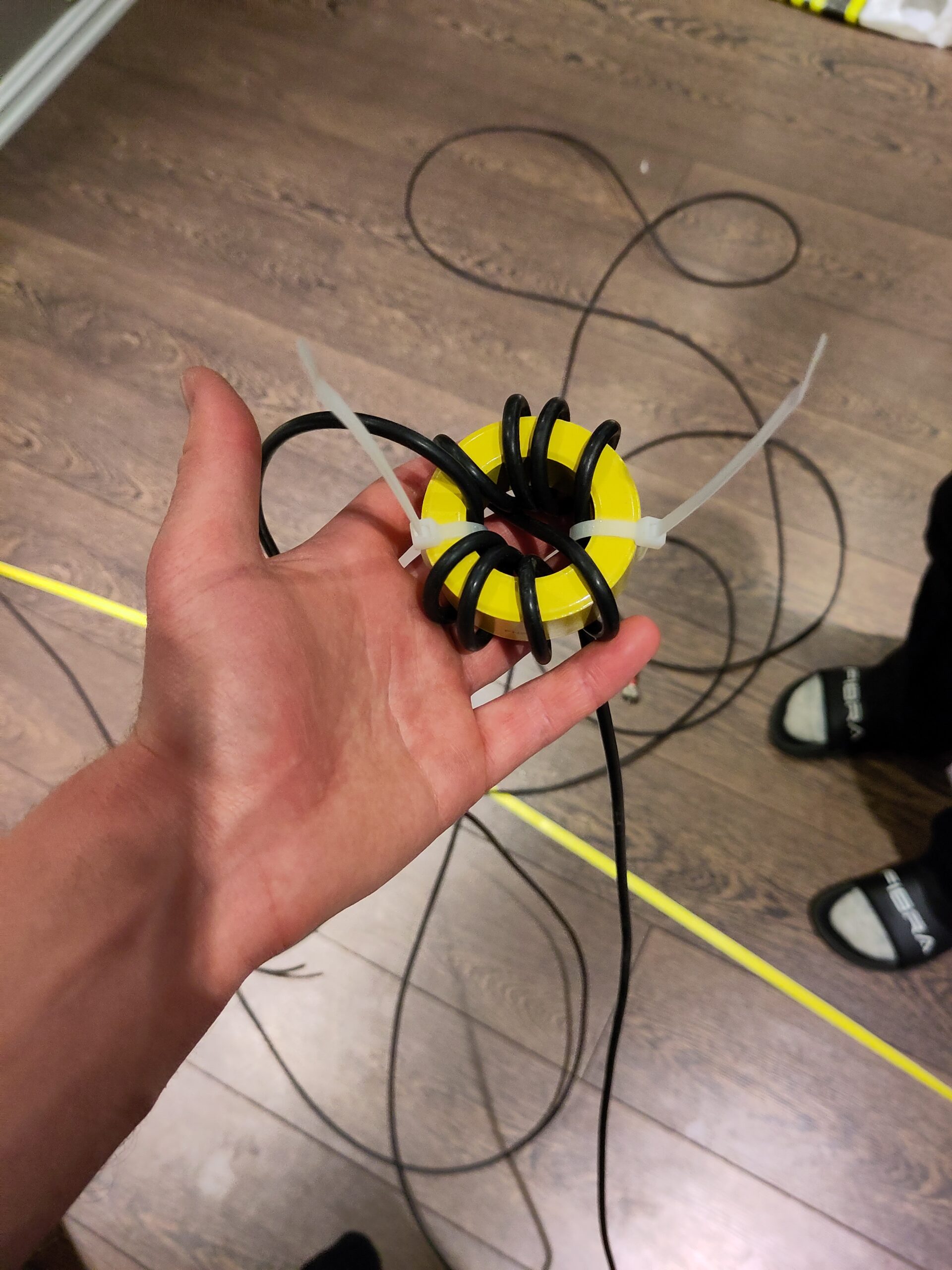 Winding took a while with the long coax, but at the end we fastened the windings with white cable ties. Then someone pointed out the similarity with a bee, with the white cable tie wings and black cable over yellow ferrite. A bee also seemed fitting for to find at a flowerpot antenna.