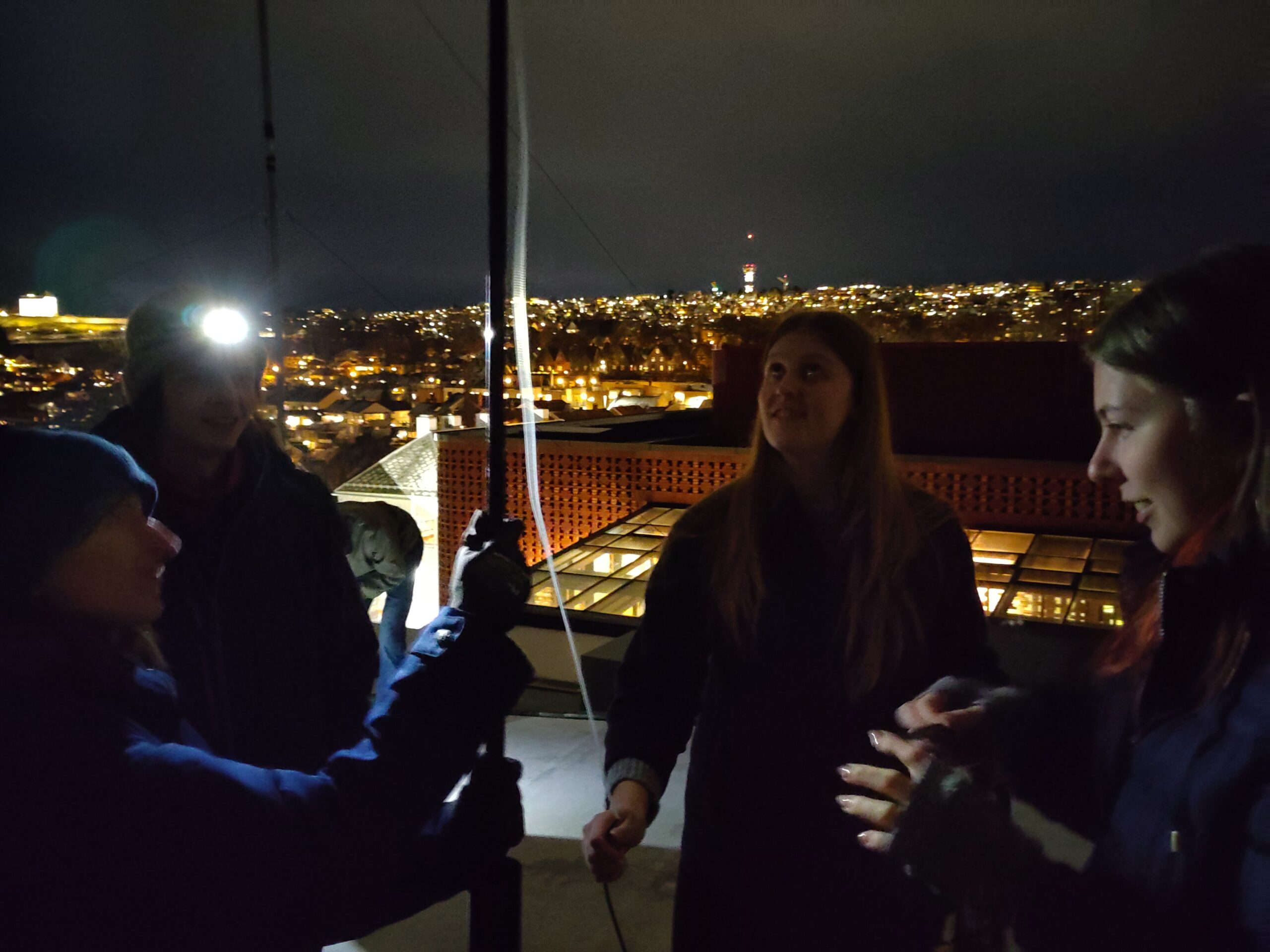 Measuring the resonance of the antenna, in the dark. From left: Marianna, LB5GJ, Karine and Tiril. Photo: LB5DH