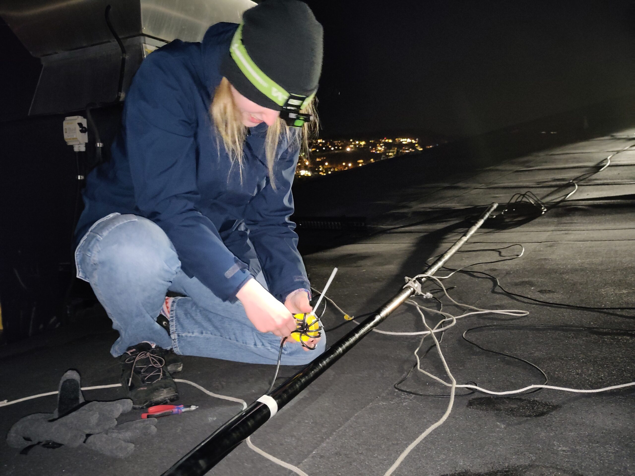 The following Monday, we set it up on the roof of Samfundet, with the intention of tuning it. To do this, we taped it to a glass fiber mast, erected it on the roof, and measured the SWR. Then we adjusted the length by moving the choke and tried again. This turned out to be quite a cold, iterative process, but we eventually got the SWR dip at the right place. First, it was only down to 2:1, but it improved when we moved the antenna further away from the other antennas on the roof.