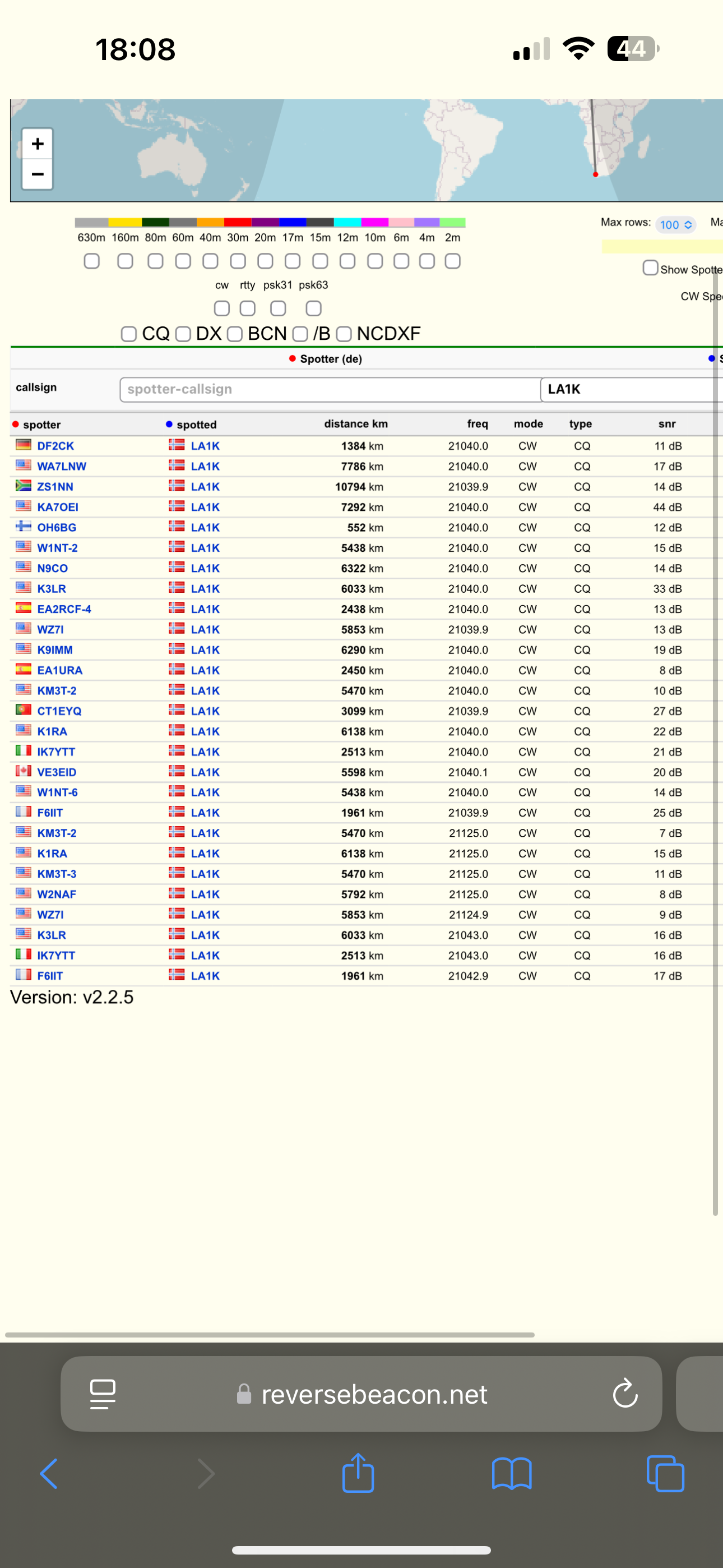 The spots from RBN. The ones at 21.125 MHz is the quarter wave vertical(5 spots) and the ones on 21.040 MHz(19 spots) is the flowerpot antenna. Screendum from reversebeacon.net