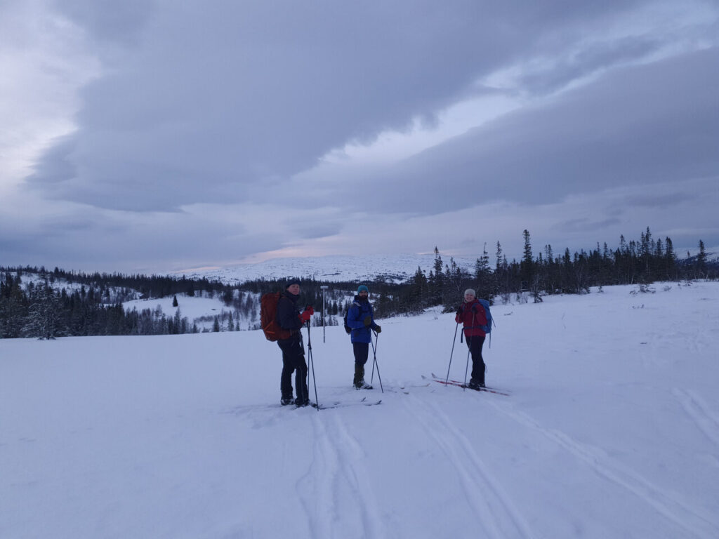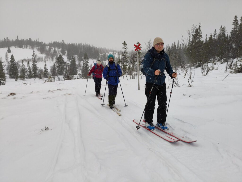 At the parking lot near Mårråkstuggu, we prepared our rather mixed collection of skis. LB9JJ brought mountain skis, LB6GH used an old kind of back-country skis, LB5DH went with Telemark skis, and DB4STI had borrowed a pair of randonnée skis for the tour.